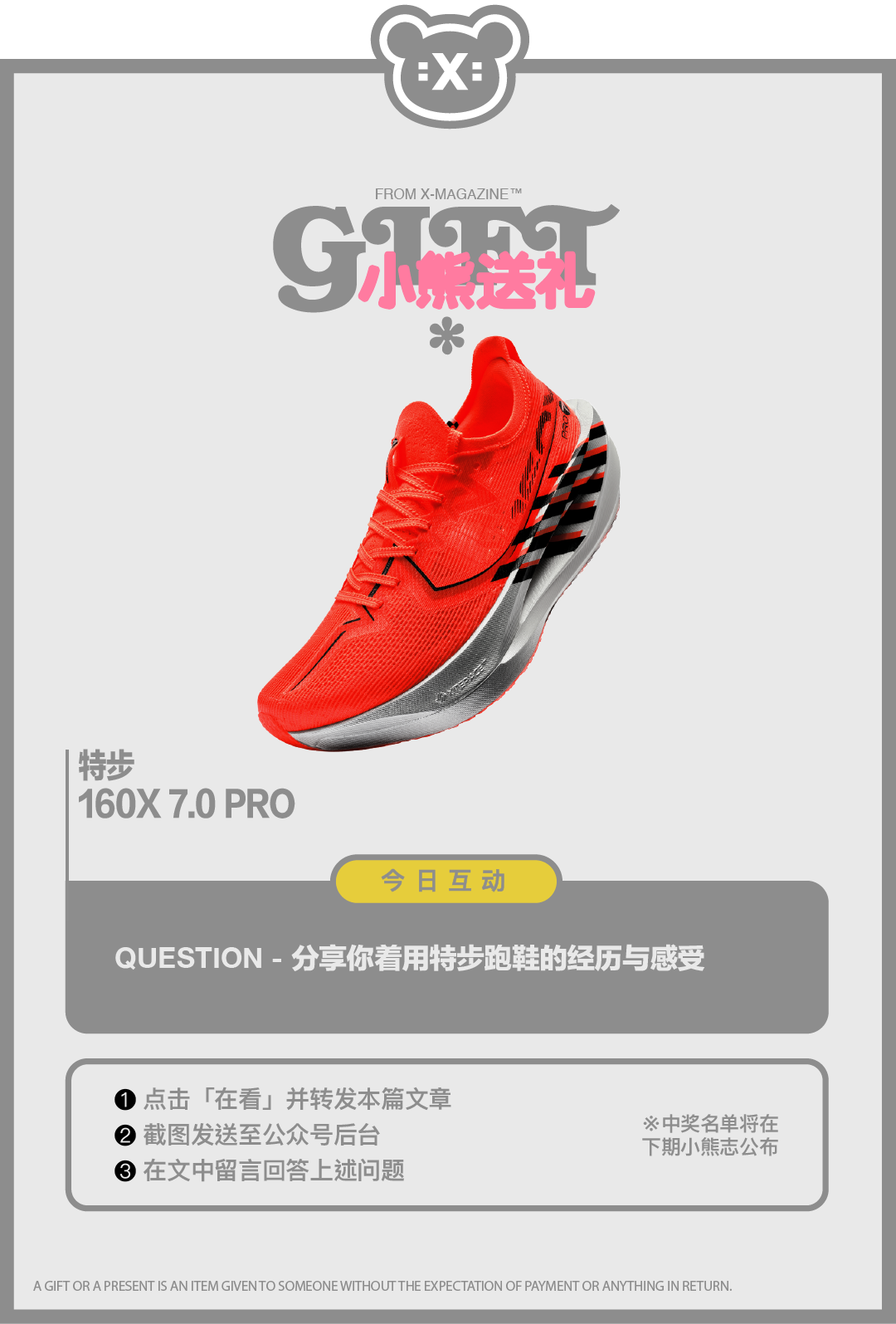 站在发布会现场,我能切实感受到特步“专业影响大众”的品牌理念。160X 7 代与青云系列的同台亮相,不仅是“专业竞速”和“大众慢跑”的双重诠释,更是特步在跑步生态布局上的一次全面展现。从冠军跑鞋家族到缓震跑鞋家族,特步正在用科技拉近与更多跑者的距离,让每一个人都能在奔跑中找到属于自己的“更进一步”。