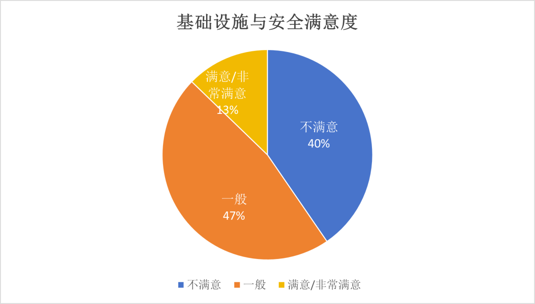 近9成的受访者表示“一般”或“不满意”,反映出该方面极大的改善空间。主要问题包括路面破损、人车混行、不平整、雨天积水等。
