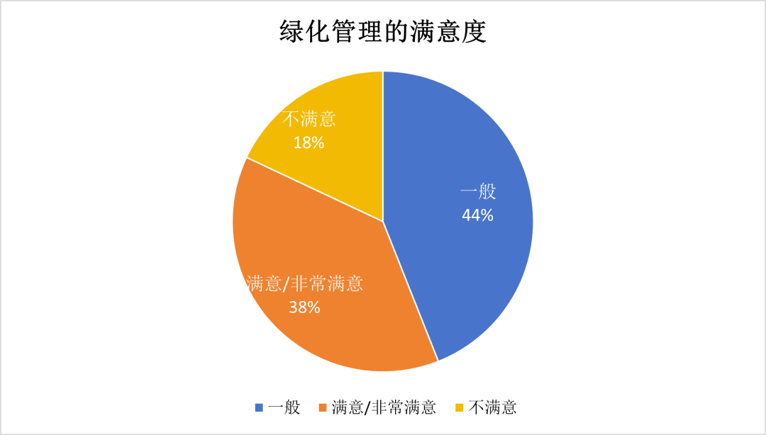 “一般"占44%,"非常满意"占38%,呈现“两极分化”。主要问题集中在树木和垃圾两大方面。