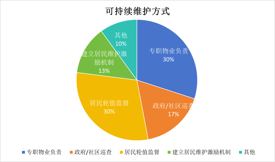 在维护方式方面,认为可以发挥居民作用(建立居民维护激励机制或居民轮值监督)的受访者占了43%,而认为可以由专职物业负责或政府/社区巡查的受访者占了47%,两种声音旗鼓相当。