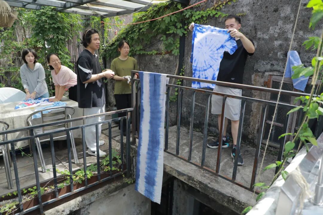 在老师的指导下,同学们纷纷动手实践,或打褶、或捆绑、或折叠、或夹染,创作灵感不断碰撞。染液中的白布慢慢染上了图案,各式各样的纹样渐次展开,大家沉浸其中,乐在“染”中。活动结束前,师生们与自己的原创扎染作品合影留念,一件件作品,不仅是手艺的成果,更是创意与文化的融合。