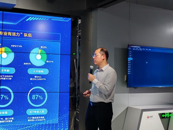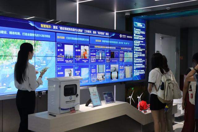 在数字低空发展、工业化发展区域,讲解员借助视频与图片,介绍了联通公司在网络安全构建、智慧海洋、医疗等多领域的应用和技术成果。讲解员提到,同学们在未来的职业道路上可以多多关注交叉学科的学习,拓宽思维,将数字化技术应用到更多领域。