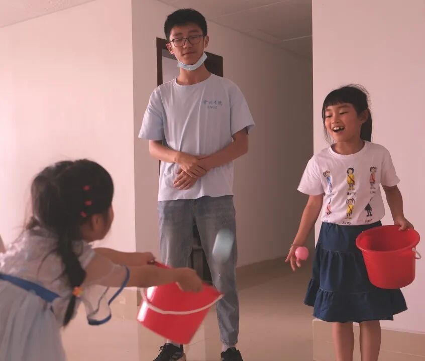 最后,在实践队成员的组织下,孩子们相互配合进行了投接小球活动。该活动需要孩子们两两一组一投一接,是对默契度的一次大考验。