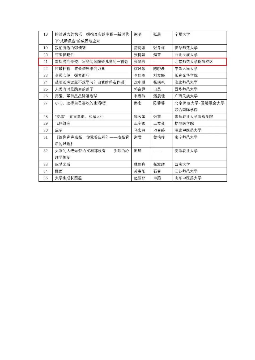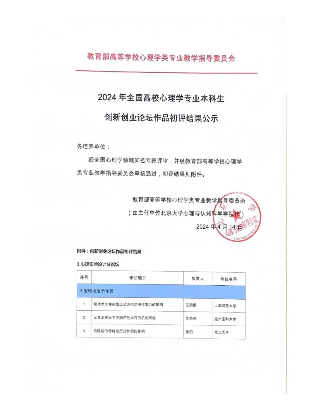 2024年4月15日,“全国高校心理学专业本科生创新创业论坛”全国决赛结果公示,文理学院心理系共选派4支队伍参加决赛,1支队伍入围全国总决赛一、二等奖评审,3支队伍荣获全国三等奖,获奖率100%。