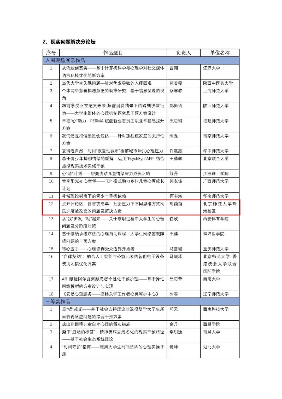 本论坛旨在落实立德树人根本任务,提升科学研究和实践转化能力,共涵盖四个分论坛。2024年3月我校初赛结果公示,共收到文理学院心理系21级、22级同学的作品13件,其中心理实验设计分论坛作品5件、心理学产品设计分论坛作品4件、现实问题解决分论坛作品5件、心理学产品设计分论坛作品4件、心理科普短视频分论坛作品3件。经文理学院心理系五位专业老师评审,4支队伍入围全国决赛。