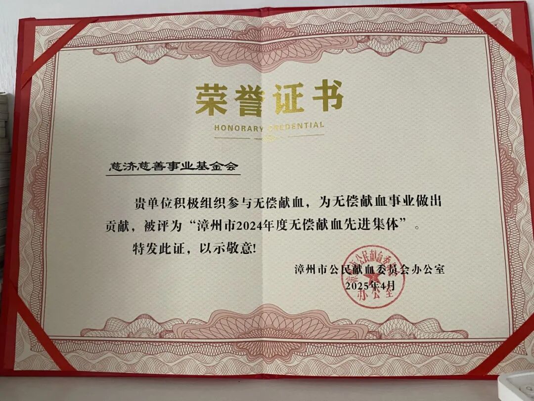 4月,漳州市中心血站向慈济基金会及志工黄梅方颁发荣誉证书。血站感谢慈济自2018年以来携手紧密合作,积极邀约团队及个人参加献血,每年两次坚持在漳州举办献血活动,为保障血液供应贡献重要力量。