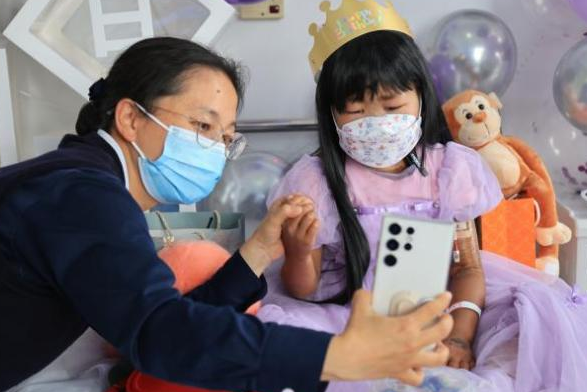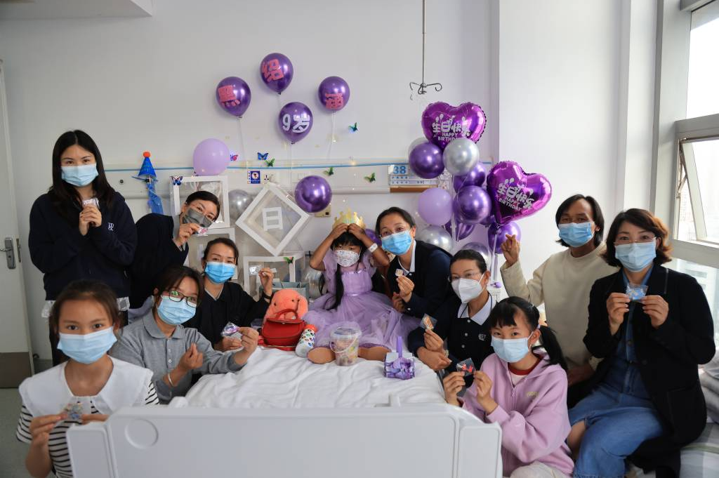 在云南昆明,志工从2024年3月开始陪伴8岁的白血病患儿小黑。第四次移植后,小黑一句“我想提前过生日”的希望,志工即刻行动,购置小黑最向往的紫色公主裙,定制蛋糕。5月1日,志工在医院为她圆梦,小黑含泪比心:“今天是我最开心的一天!”