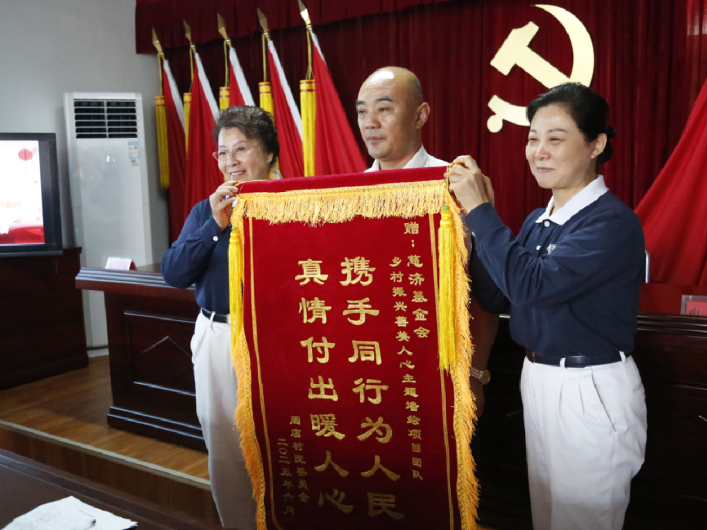 6月28日,阎店村村委会与我会签署为期五年的《关爱乡村长者营造和美新乡村合作协定》,村委会致赠“携手同行为人民 真情付出暖人心”锦旗。