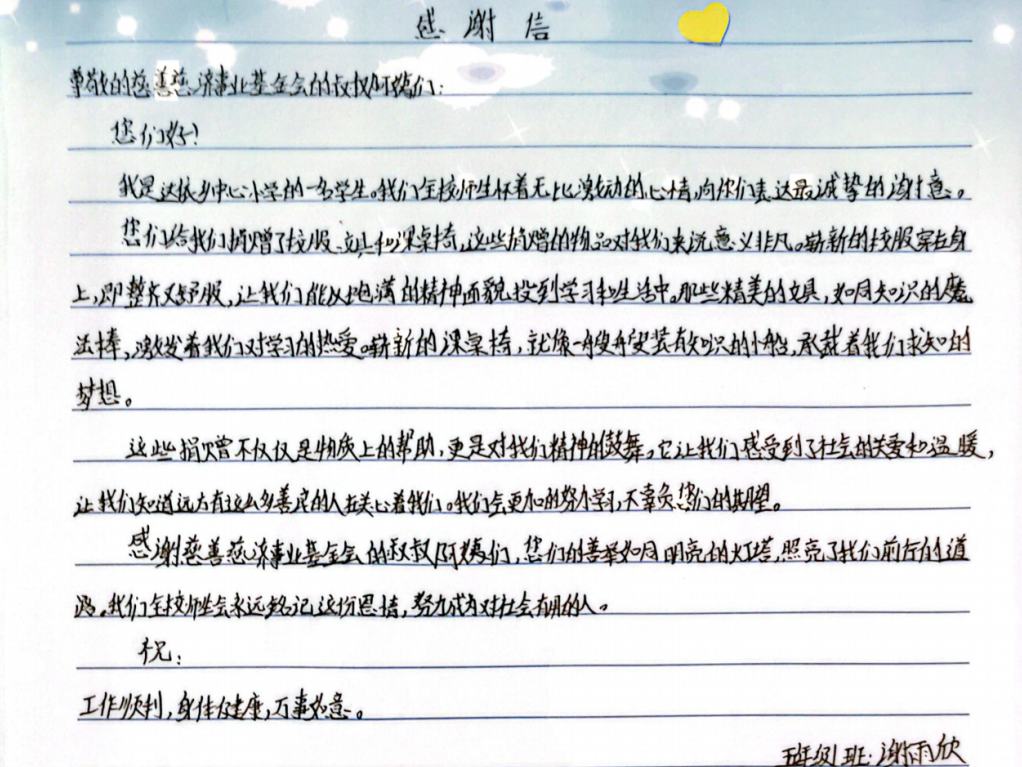 4月中旬,厦门志工跨越千里,入户向困境环卫子女捐赠新芽奖助学金;并将新课桌椅、校服与文具送达赫章县达依乡中心小学。孩子们手写了25封感谢信。