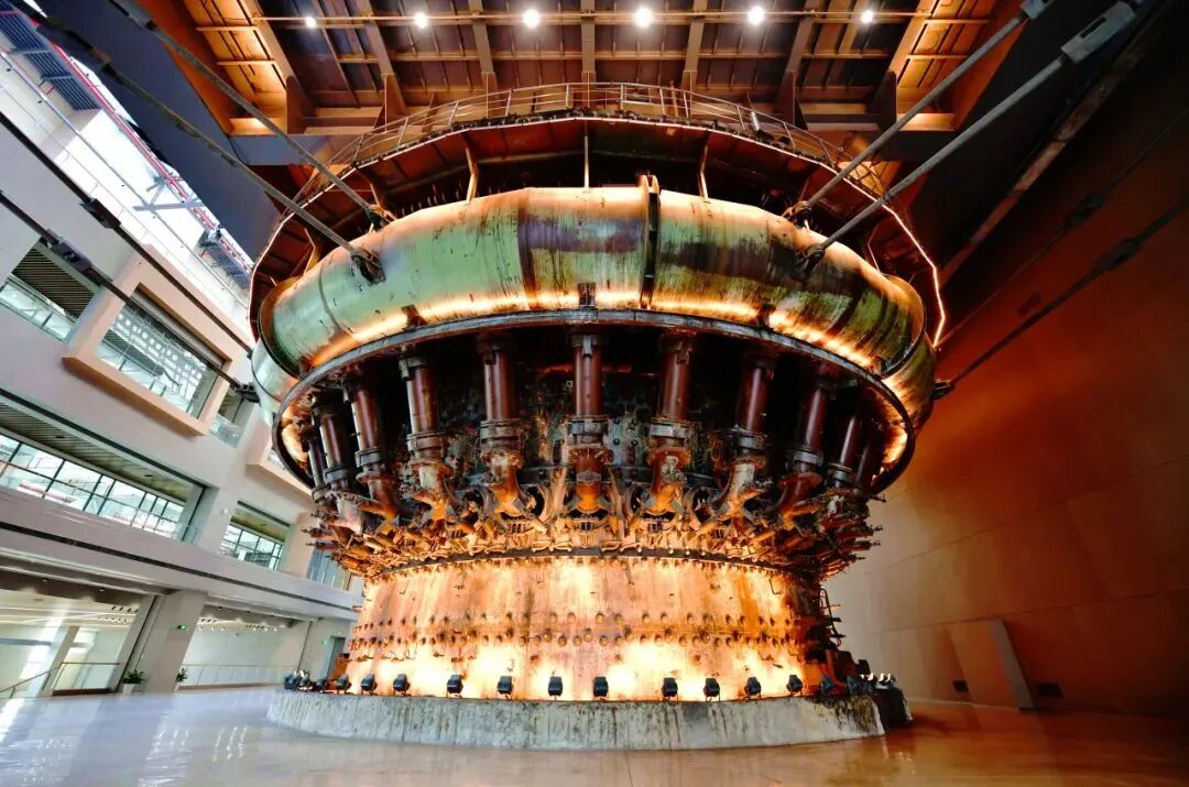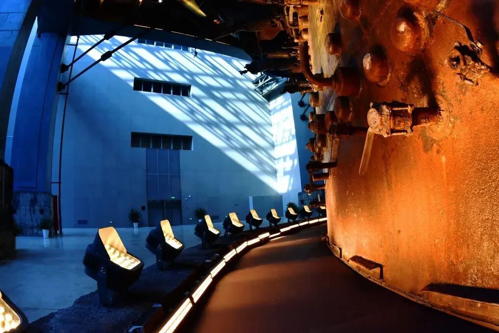 乘坐电梯来到二楼,穿越“时空隧道”,就能抵达最为壮观的“金色炉台”。这里曾是中国钢铁工业的“心脏”——上海第一钢铁厂2500立方米高炉。驻足细观,你会发现整个高炉被黑金的氛围所包裹,锈蚀的齿轮在阳光下映射出斑驳的痕迹,那一根根熏黑的风管也在诉说着曾经的历史。