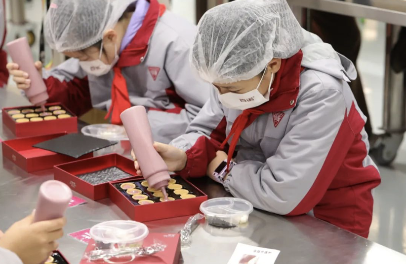 逛完展厅后,家长就可以带着孩子去体验DIY巧克力手工制作。在专业老师贴心的指导下,孩子们将香醇丝滑的巧克力浆料缓缓注入模具,发挥自己的想象力和创造力,撒上花生碎多种小料。最后,只需耐心等待脱模,这份凝聚亲子温情与创意的甜蜜成品,就能开开心心地带回家!