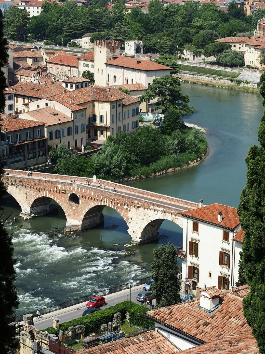 在老城之外,阿迪杰河蜿蜒而过。横跨在河上的彼得拉桥是维罗纳最古老的桥梁,最早可以追溯到古罗马时期。虽然曾在二战中被炸毁,但后来被完整修复,如今依旧保留了古老的风貌。走在河边的树荫下,看河水在阳光下闪烁,仿佛这座小城的历史与当下,都在这一刻缓缓流淌。