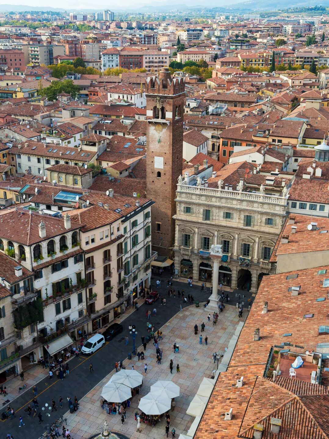 香草广场(Piazza delle Erbe)是维罗纳最热闹的生活中心。这里曾是古罗马的论坛,四周环绕着历史悠久的建筑,包括中世纪宅邸、威尼斯风格的宫殿和古老的钟楼。如今广场上仍然充满生机,在琳琅满目的中央市集,能淘到不少本地特产,比如周边丘陵出产的橄榄油和柠檬甜酒(Limoncello),摊位间还会摆满彩色陶瓷和绘有古城风景的小摆件。
