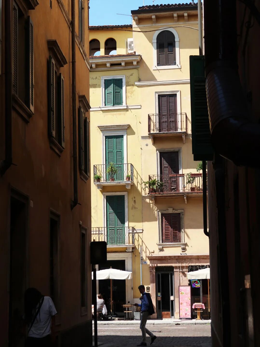 如果说广场和景点是维罗纳的“名片”,那么小巷和河畔才是它的日常。在维罗纳老城,我最喜欢的事就是听着精心挑选的意大利旅行歌单,不用导航,一个人漫无目的地穿行在一条条陌生小巷里。小巷里有着跟喧闹的香草广场截然不同的氛围,道路不宽,阳光打在彩色墙面和木质窗格上,漫步其中,脚步会不自觉地放慢,仿佛这座城市天生就适合用 0.5 倍速去感受。