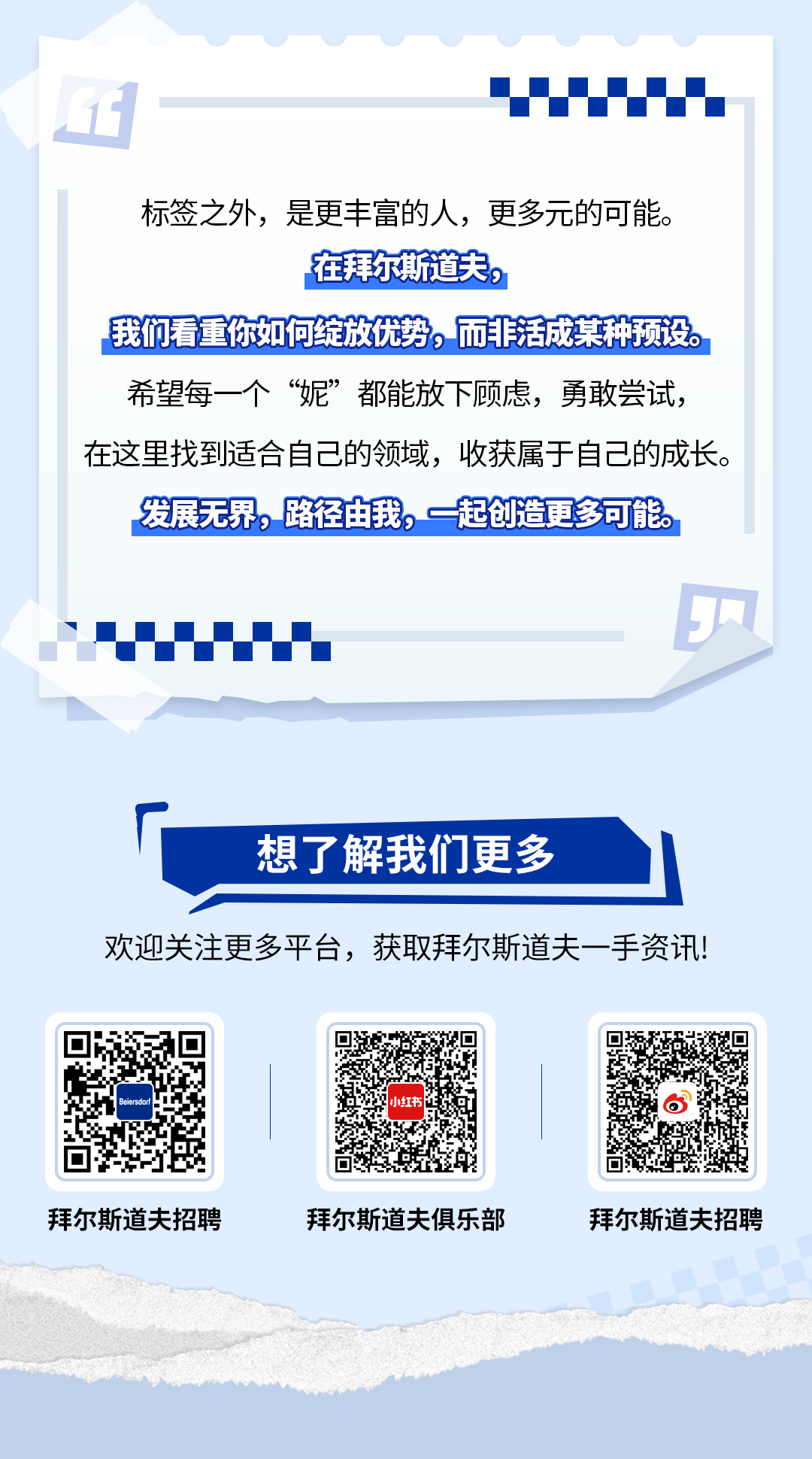 文章内容来源于公众号:拜尔斯道夫招聘,点此可查看原文,内容版权归相关企业所有,本网站仅供交流学习。若涉及版权问题或存在侵权情况,请及时与我们联系,我们将第一时间进行删除处理。
