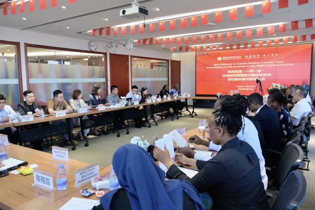 2025年8月25日,由国家商务部主办、福建省对外经济合作中心承办的“一带一路外贸结构调整能力建设研修班”(以下简称“研修班”)到访北京市盈科(福州)律师事务所(以下简称“盈科福州”)参观交流。盈科中国区执行副主任、福建区执行主任东海霞,盈科福州管委会委员陈东律师等人热情接待,福建省对外经济合作中心业务综合部负责人贺磊一行以及来自“一带一路”国家的政府官员、企业代表、行业专家。交流过程中,盈科律师团队与外宾用英文展开深度对话,氛围热烈。