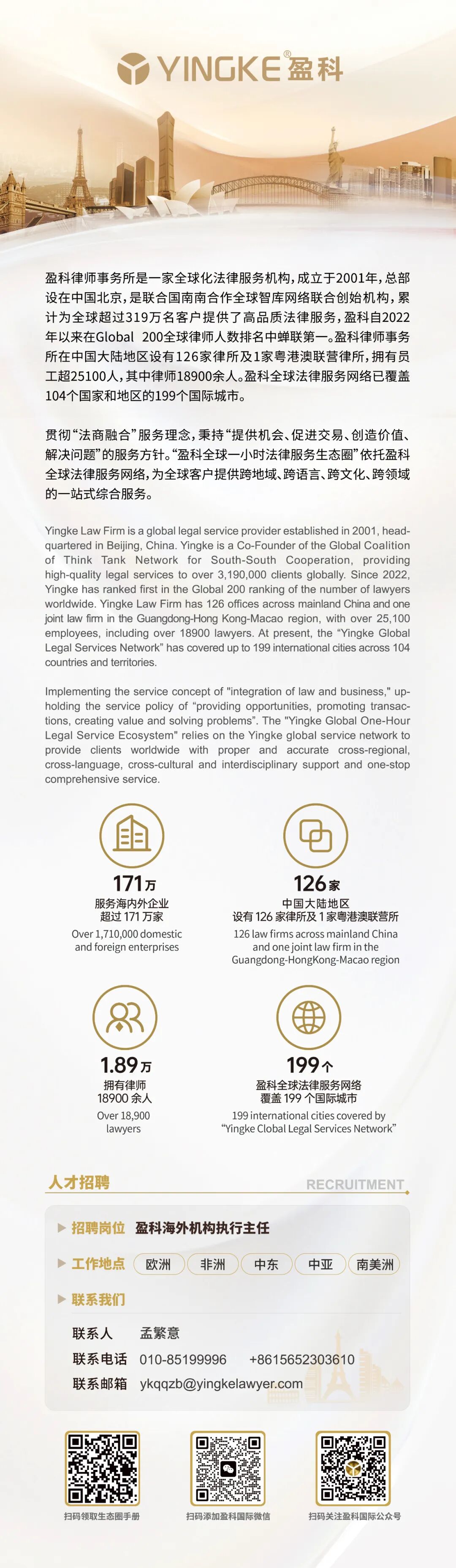 盈科全球一小时法律服务生态圈,是由中国社会科学院法学研究所、国际法研究所提供学术指导 ,盈科律师事务所、YK LAW与华舸会计师事务所发起设立,联合全球各领域专业机构组成的全球一站式综合服务平台。截止目前,盈科全球法律服务网络已覆盖104个国家和地区的199个国际城市。盈科海外机构已覆盖46个国家的57个国际城市,并计划在2028年建设完成100家海外机构,与国内127家分所、国外100余家国际合作法律服务机构实现“三个100”融合发展、互联互通,为全球客户提供全球一小时法律服务响应机制,包括:1.了解客户需求;2.匹配专业服务;3.一小时内对接到位。