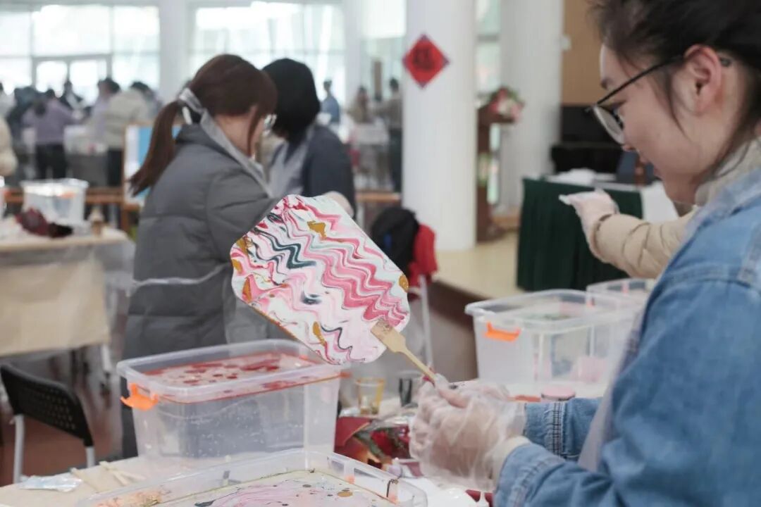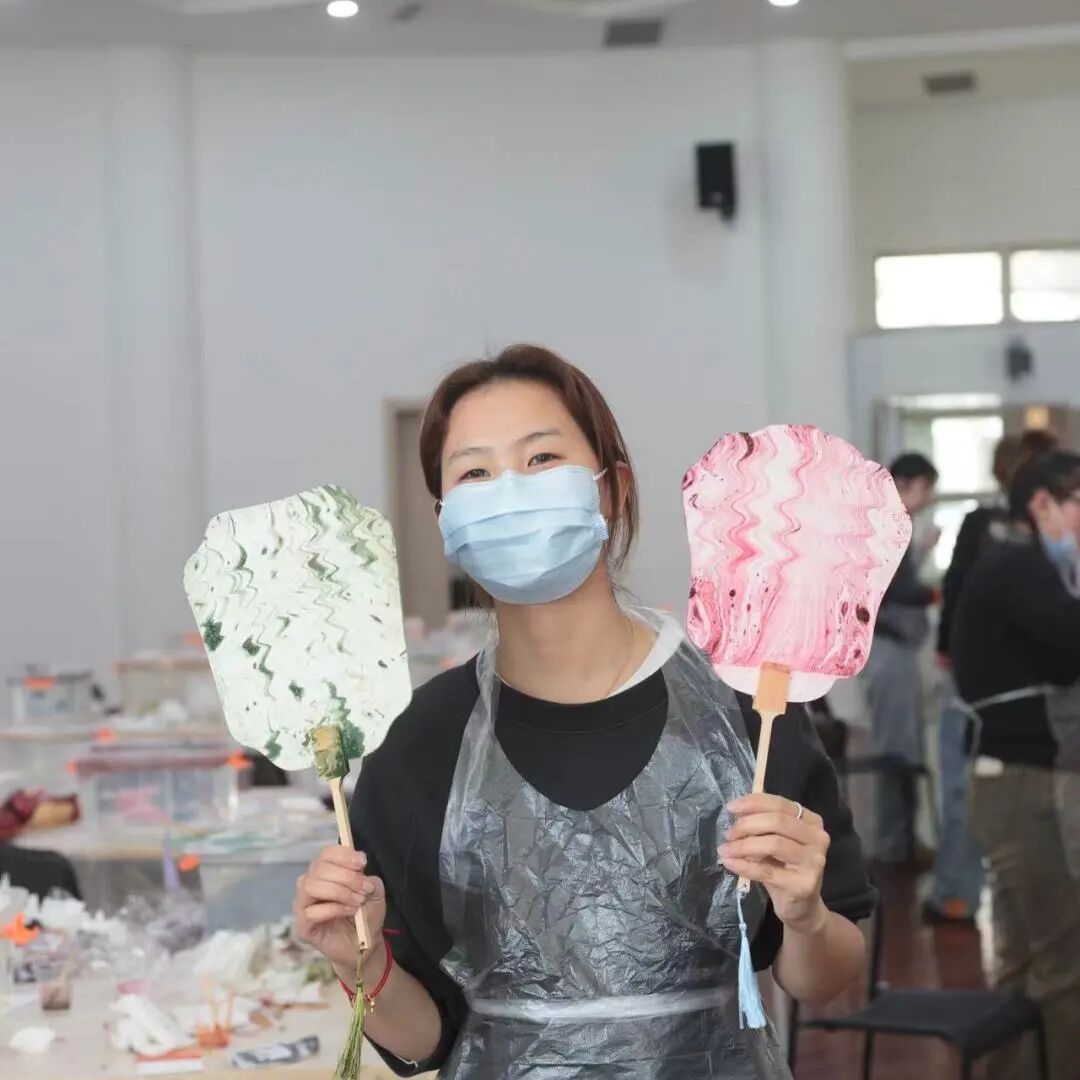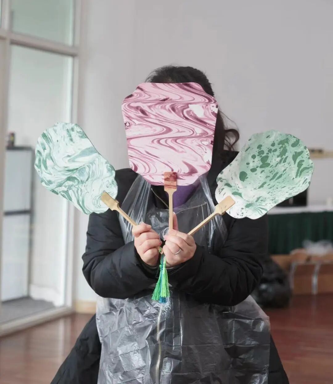 每位教师挑选完材料包后,发挥想象进行创作。大家将调好的腰果漆滴在水中划一划,各种颜色相互交织在一起。再将扇子缓缓下水,再提起,属于自己的漆扇便大功告成。大家互相交流着绘制的经验,现场洋溢着满满的幸福感!