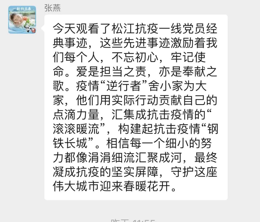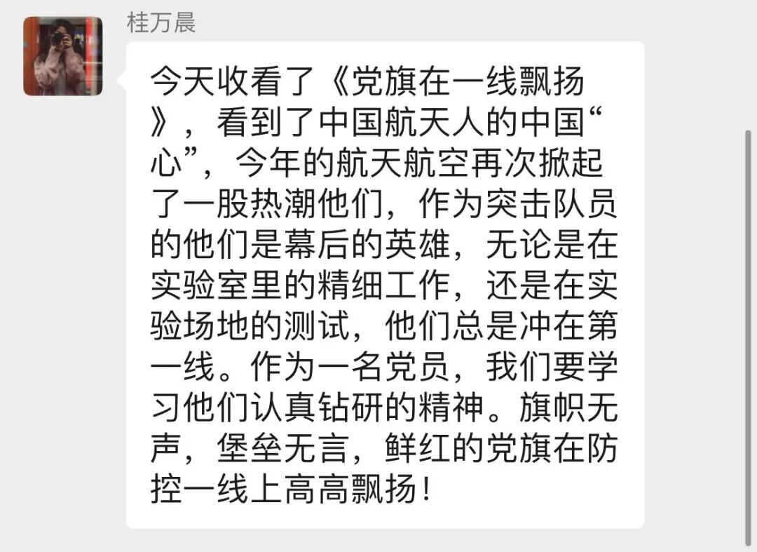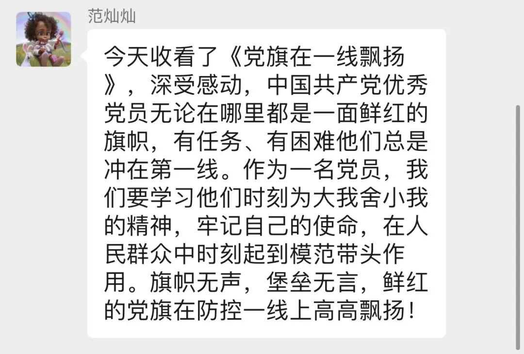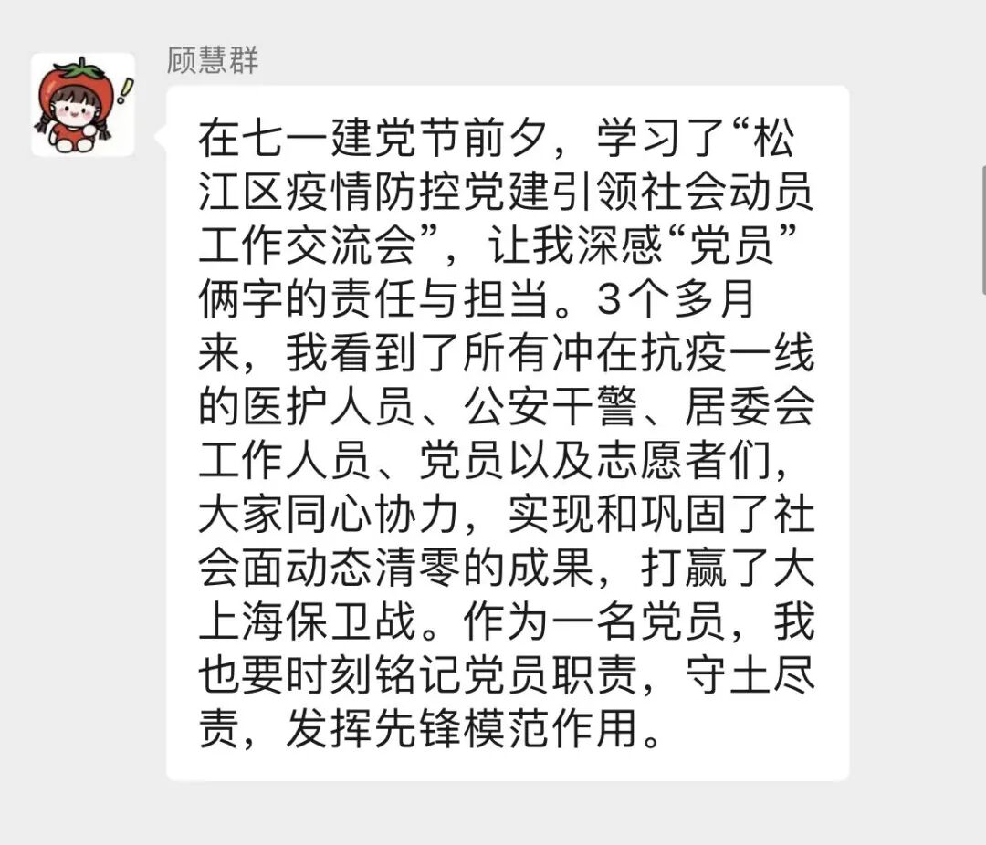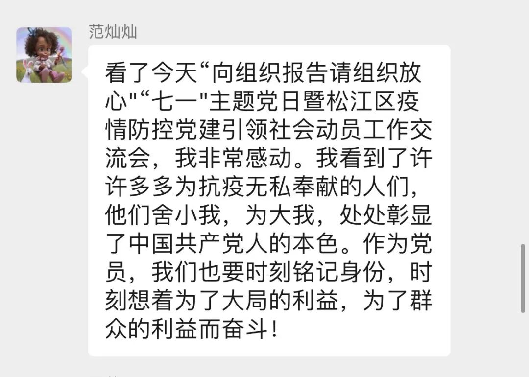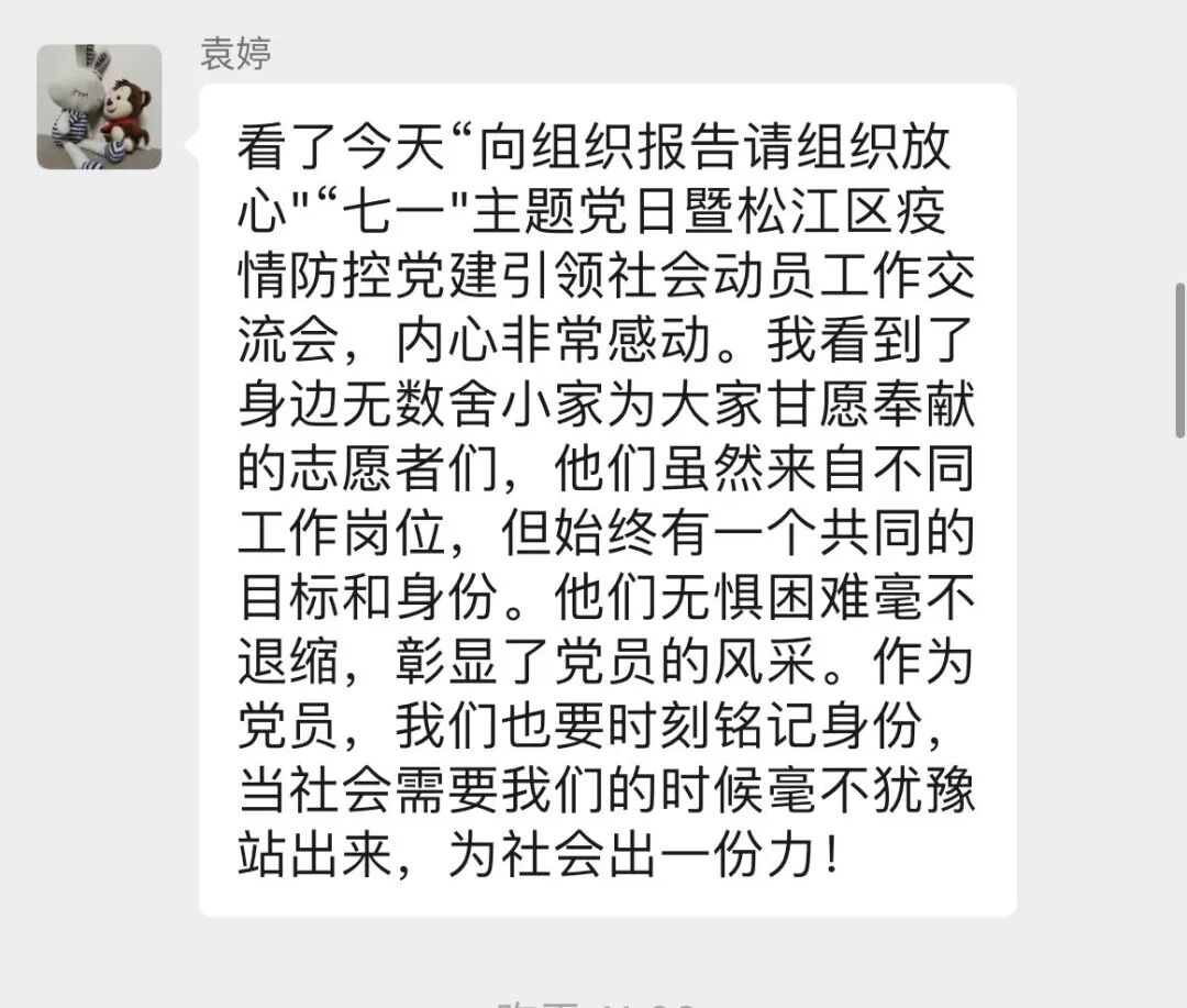 党员们观看了直播—“向组织报告请组织放心”"七一"主题党日暨松江区疫情防控党建引领社会动员工作交流会。许多感人的故事在抗击疫情工作中发生着,党员们被感动的同时也表示会积极参与各项社区工作,贡献自己的力量!