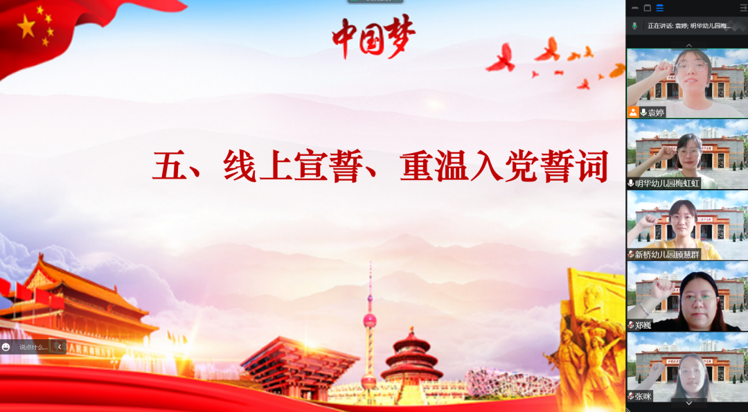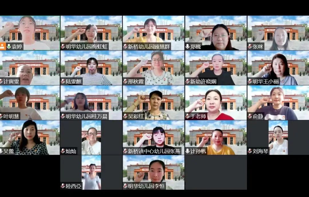 为深入学习贯彻习近平总书记重要讲话和指示批示精神,牢记习近平总书记殷切嘱托,认真学习贯彻落实市第十二次党代表大会精神,把思想和行动统一到大会精神上来。在中国共产党成立101周年之际,中共松江区新桥镇中心幼儿园支部委员会(新桥、明华幼儿园)于2022年7月1日相约云端,开展“喜迎二十大 奋进新征程”迎“七一”主题党日活动。会议由支部书记吴蕾同志主持,全体党员同志、发展对象、入党积极分子相聚云端,共同参会。