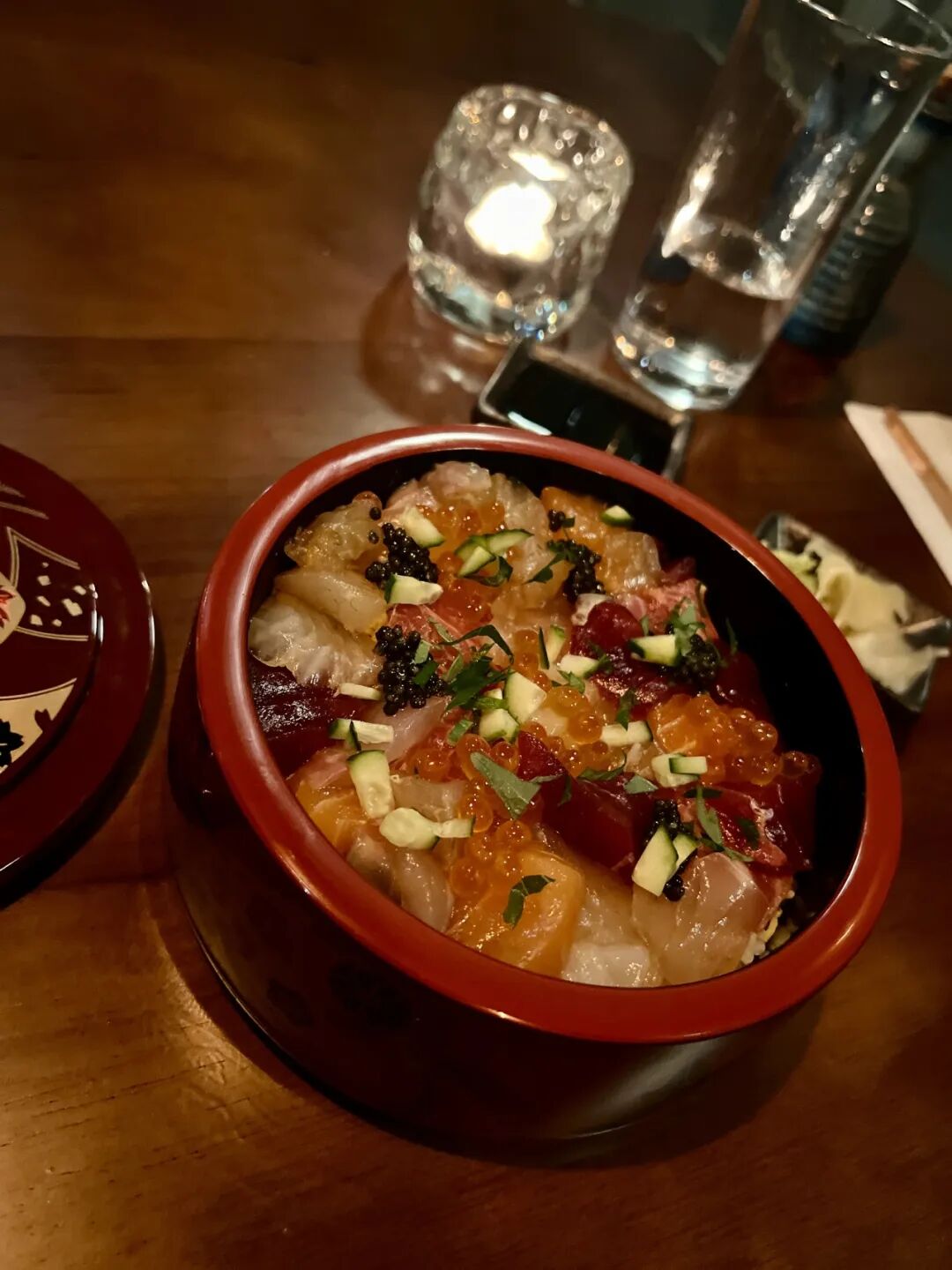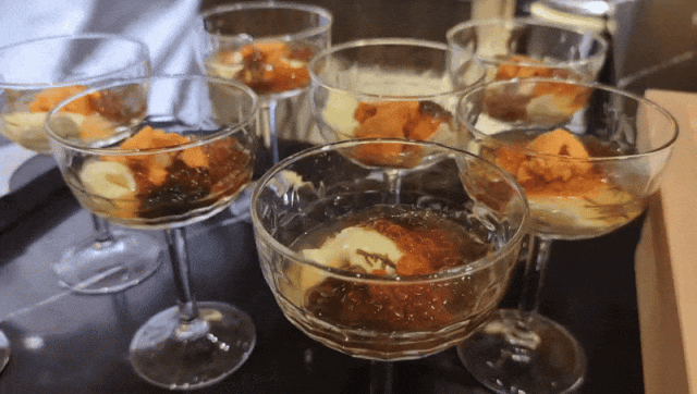 来自日本北海道的新鲜海胆,入口即化,带有轻微的碘味和海洋甜香,大甜虾肉质晶莹剔透,鲜甜滑嫩,比一般甜虾更大更稀有,入口Q弹、清甜且带壳甜味脂肪,日本冲绳特产水雾海藻,味道柔和、略带酸味。