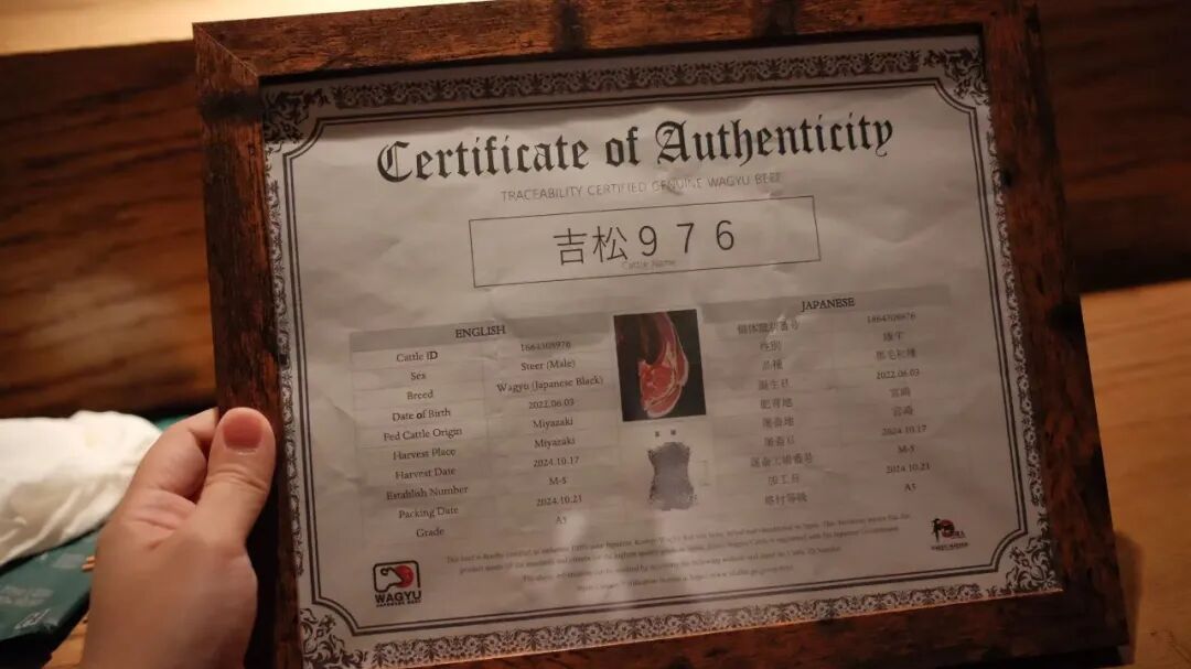 对吃有研究的家人们对和牛一定不陌生,这种来自日本的高级牛种,以脂肪排布出来的大理石花纹著称,肉质极其柔嫩。在吉祥屋,小编竟然第一次看到了只有高级和牛才会拥有的证书。