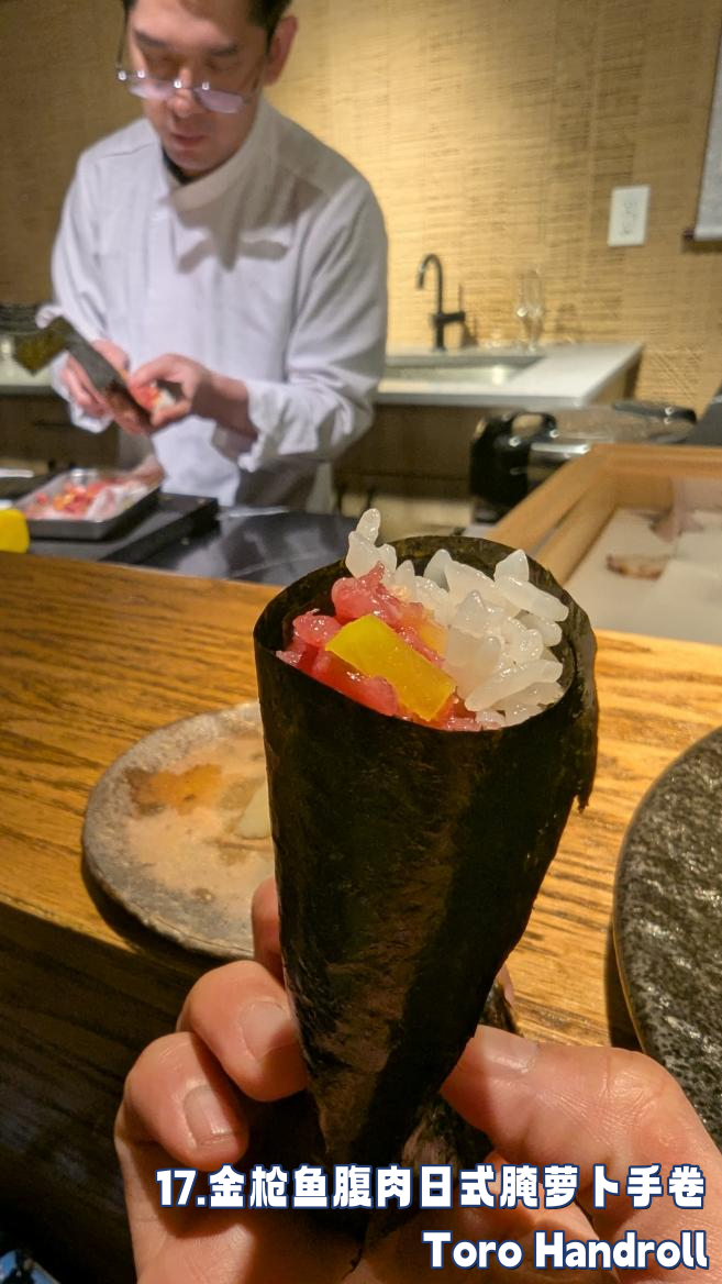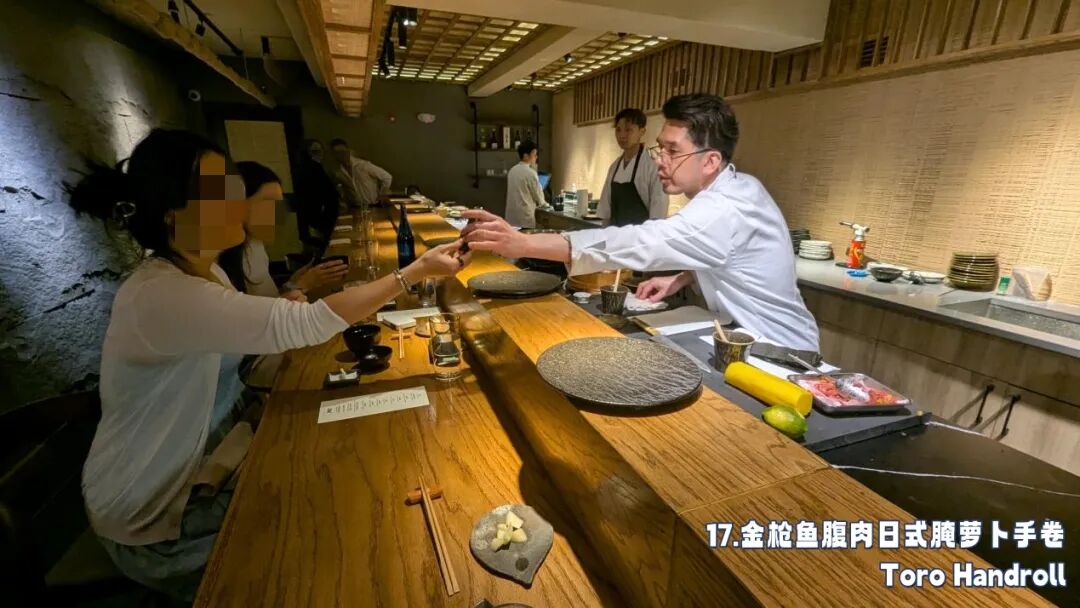 为了让大家感受道食材的温度,Omakase盛宴中的精华部分,寿司手卷,大家要用手直接从接过来,直接放在口中。