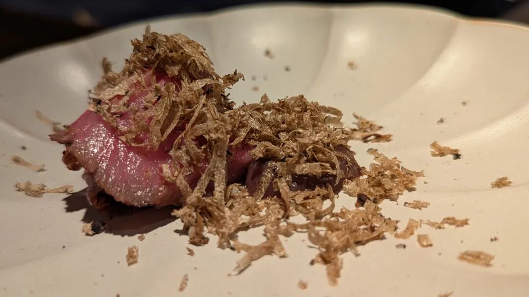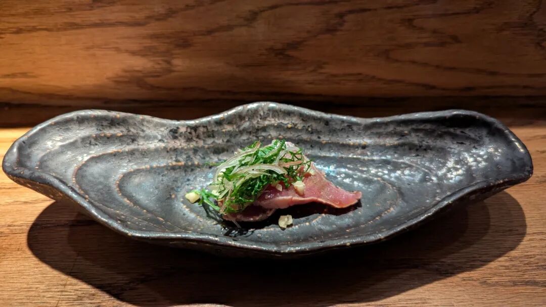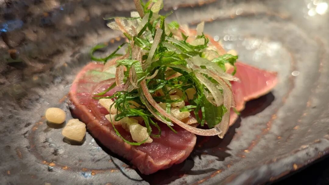 薄切后摆盘,搭配芝麻香油,酱油,茗荷姜和紫苏。肉质结实的鲣鱼风味浓郁。每一口都是散发着来自深海的香气,幸福感爆棚。