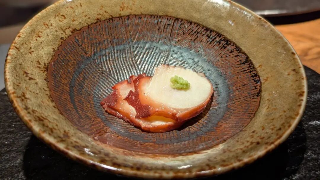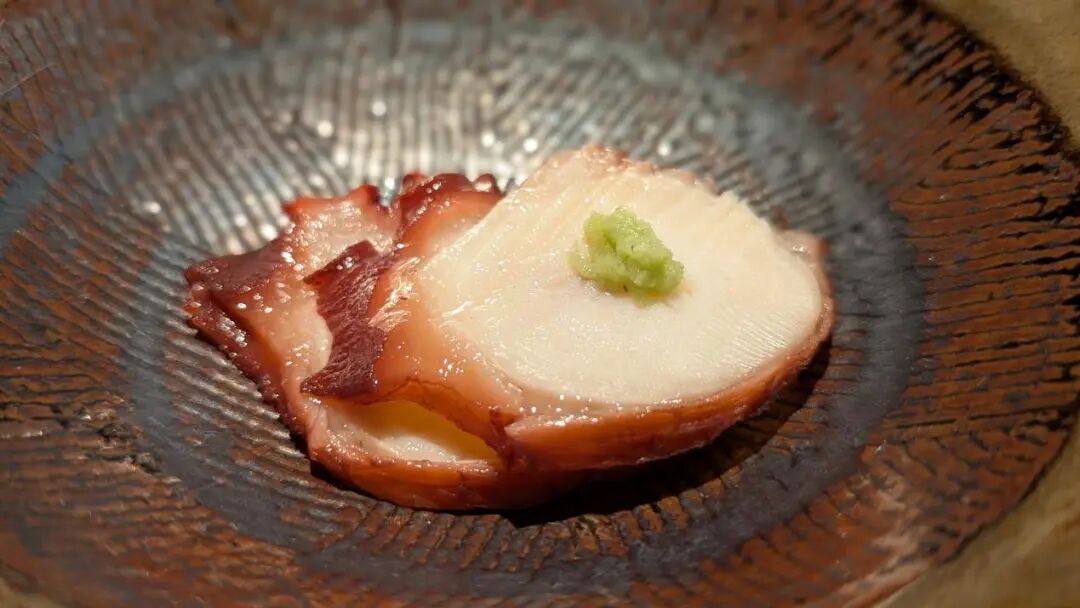 肥厚的墨鱼脚(Ika),带来视觉震撼。因为新鲜,所以不需要太复杂的烹调过程。在酱油、味醂、清酒、糖等日式调味料炖制而成,切成一厘米的厚片。