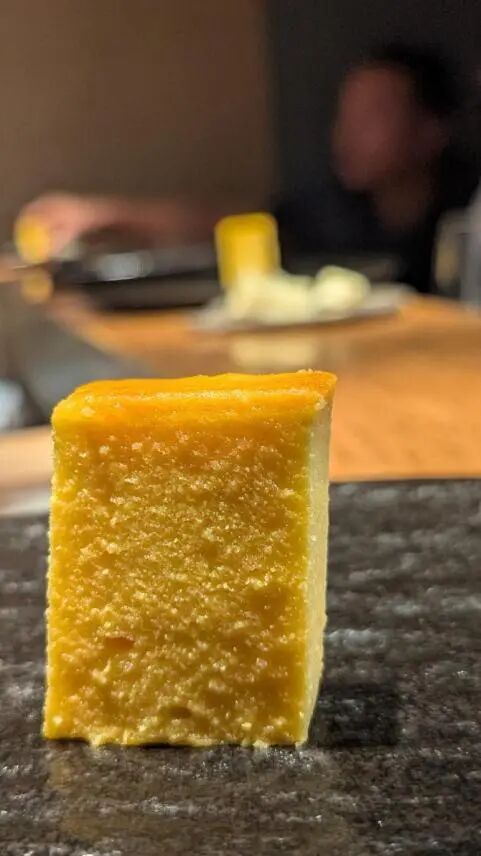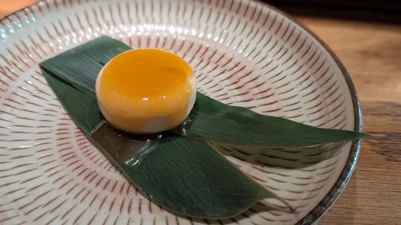 首先的一道是日式玉子烧(Tamago Yaki),有所不同的是,陈大厨在玉子烧中加入新鲜虾滑,虾肉的甜香和玉子的香完美融合,这样的创意甜品,小编是第一次吃到,绝对要为大厨点赞。