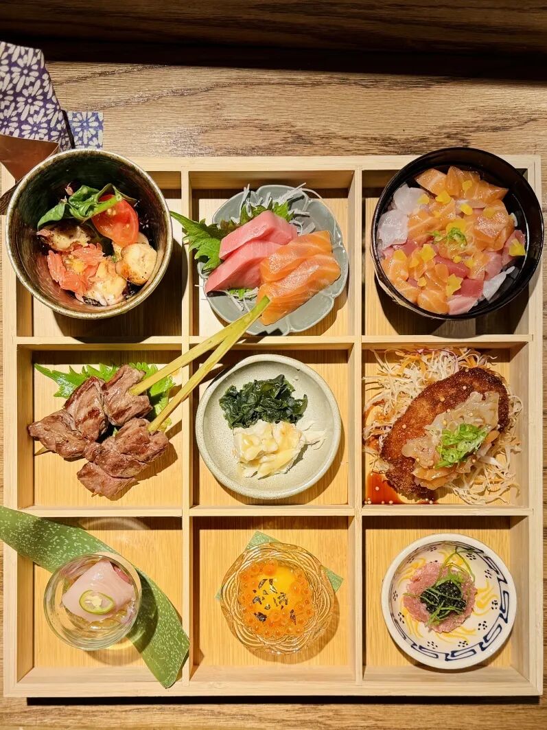 一楼,提供种类繁多的寿司、日式炉端烧和九宫格“宝盒”,还有一个自带“巴适”滤镜的吧台,秒回日本石径中的永远有朋友在等你的那间居酒屋。