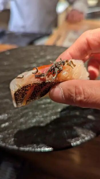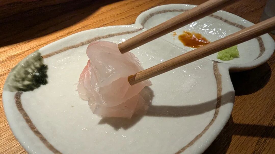 第一道是真鯛刺身(Mikan Dai)。真鯛是日本料理中非常重要的一种高端鱼类,肉质洁白、细腻、有弹性,脂肪适中。由于味道清淡而鲜美,是日本料理(特别是寿司、刺身)中最受欢迎的鱼之一。