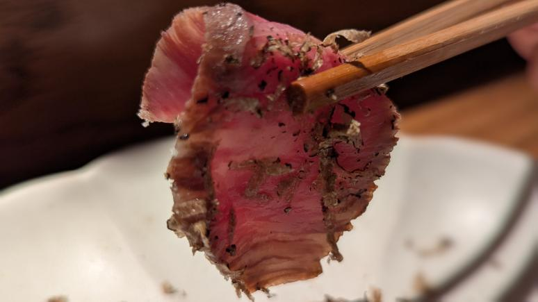 这一道鲣鱼轻炙(Katsuo Tataki)是日本高知县最具代表性的传统料理之一,新鲜鲣鱼在明火中表面快速炙烧,带出炭烧的香气,单保持外焦内生。