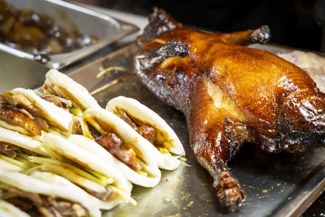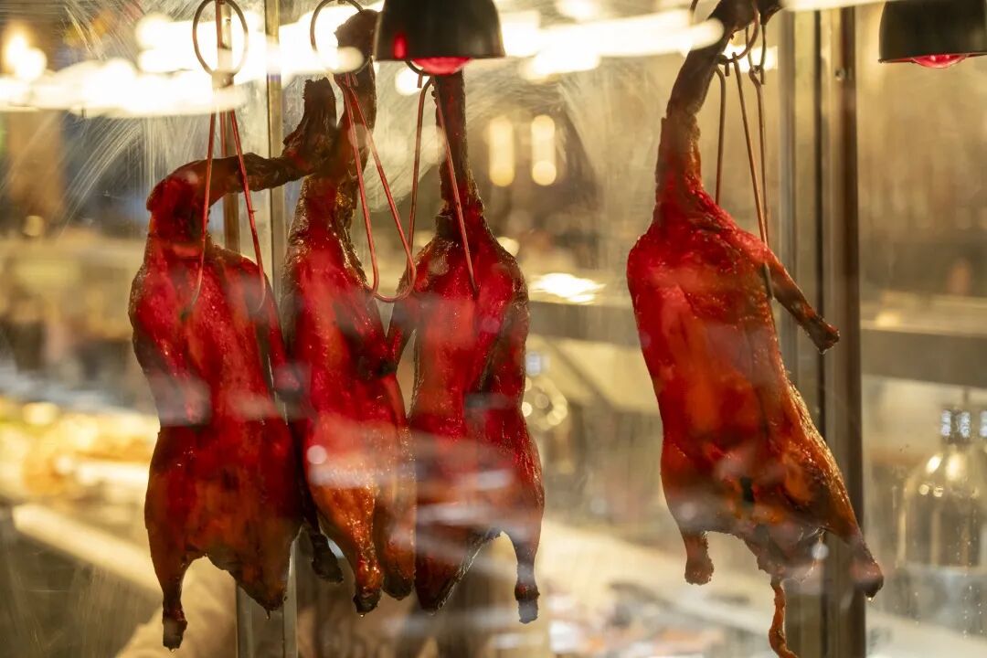 没想起惊喜还在后面。您往这边看。刚出炉,香得流油的烤鸭已经挂上了。