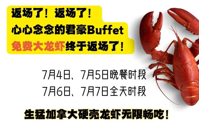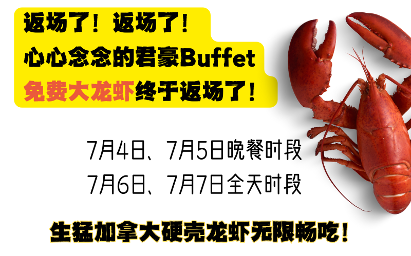 当然,也别忘了独立日至本周末(7月4日至7月7日)的特别福利,整条加拿大硬壳龙虾无限量大口吃的活动。不用我多说了吧,咱们约!君豪Buffet&Grill不见不散!!