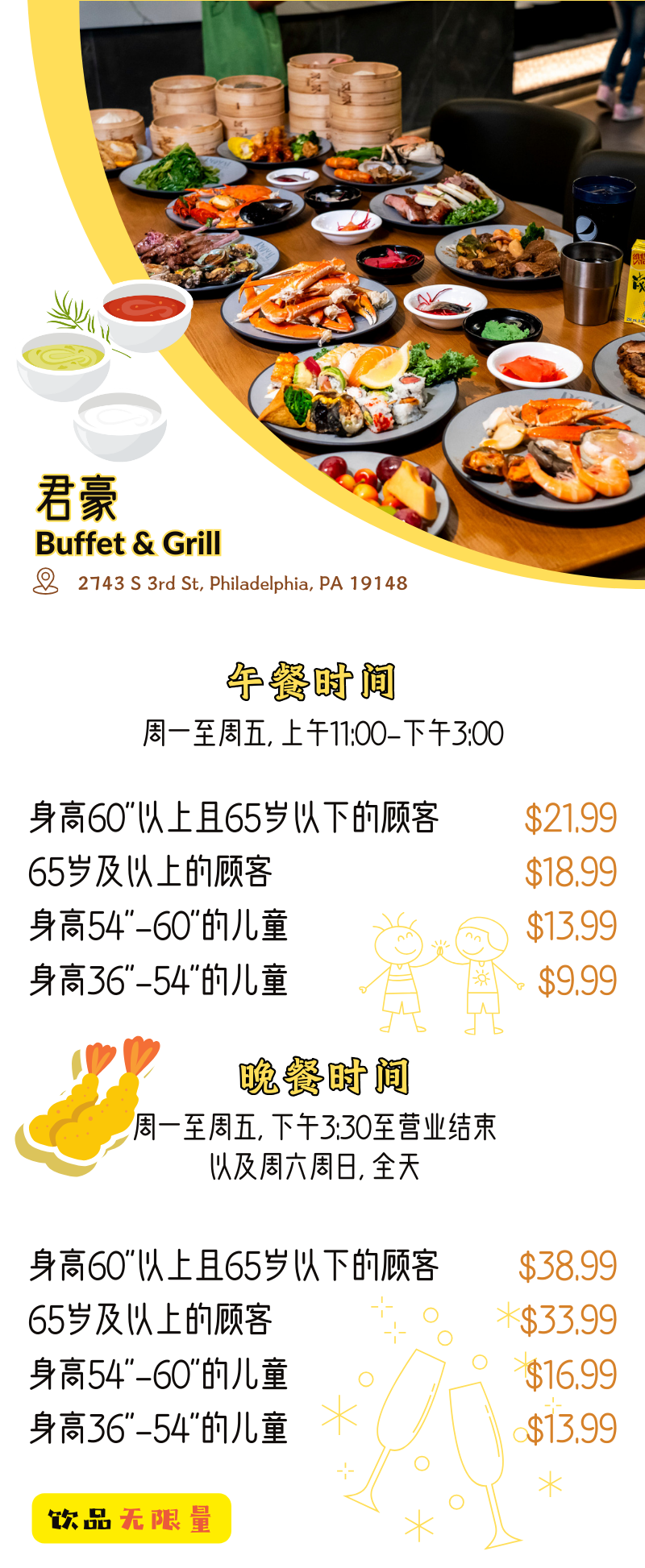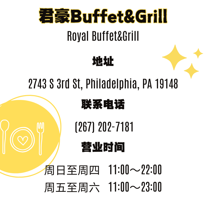刚刚开张不久的君豪Buffet&Grill就在南费城, 交通便利还有超大免费停车场, 从唐人街或者从新泽西过来,都是“一脚油”就能到,超方便。