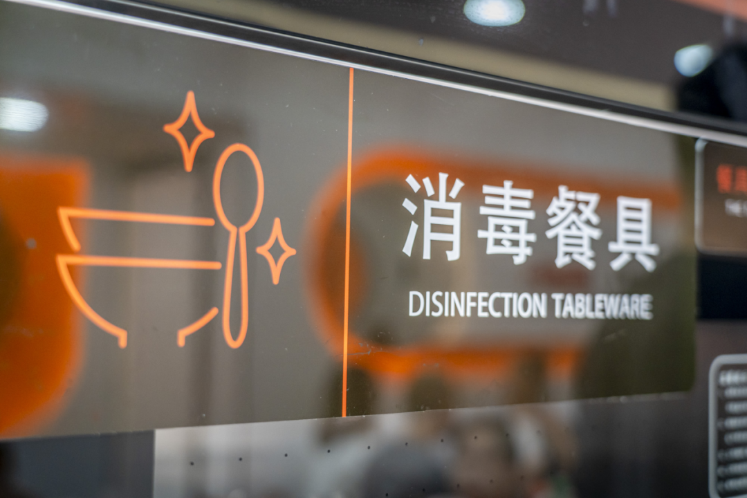 第一步:进门拿碗。所有的大碗都放在消毒柜中,卫生有保障,吃得放心!