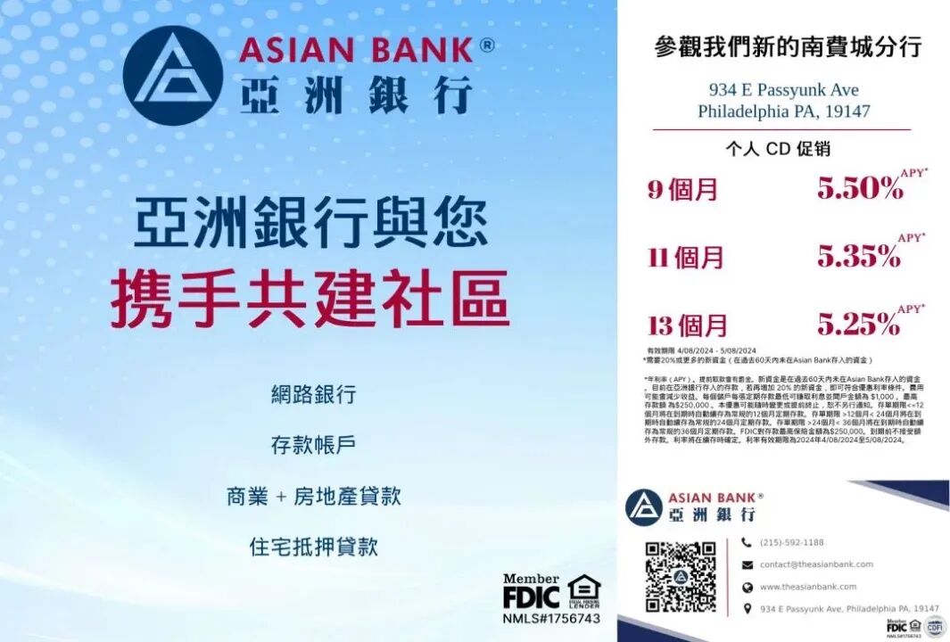 也许您错过了开业典礼,但是这年利率5.5%的高收益,相信您绝对不会错过。为庆祝第三家分行的开业,亚洲银行南费城分行现在提供个人定期存款利率特别促销活动,9个月就是能获得年利率5.5%的收益,这稳赚“躺赢”的高收益,不仅能跑赢通胀,现在把闲钱存上,相当于年底给自己发一笔年终奖。