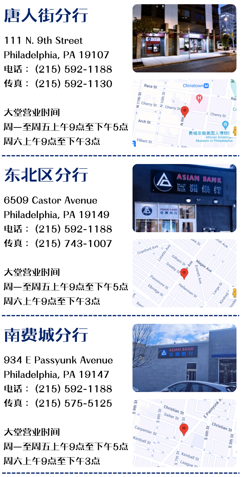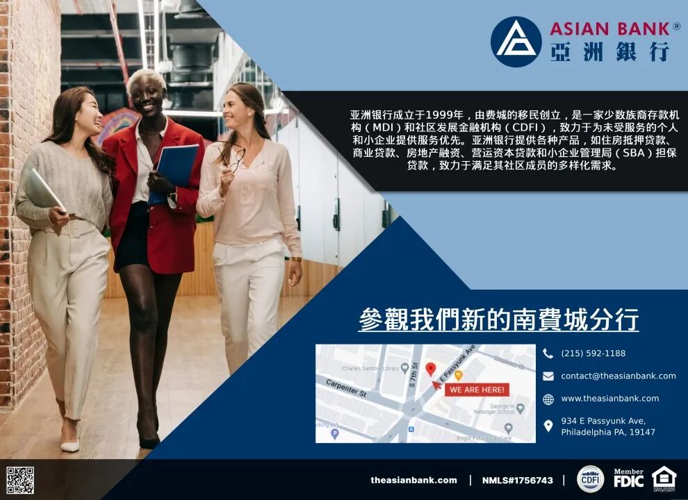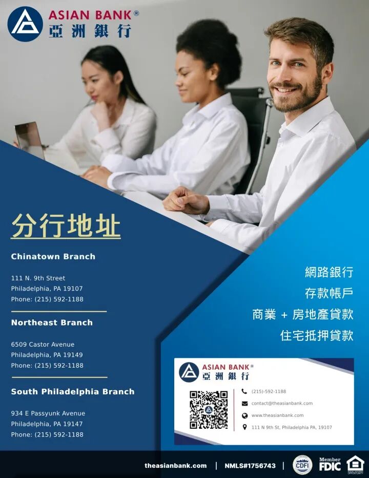 更多相关信息与问题请致电南费城分行经理Theresa Mehling: 267-486-2532 或亚洲银行通用号码: 215-592-1188,商讨您的选择、解答您的疑惑。
