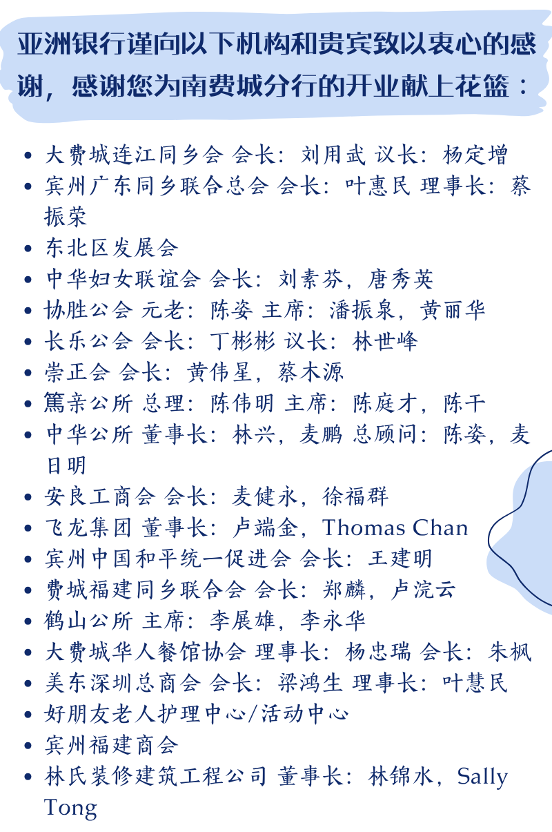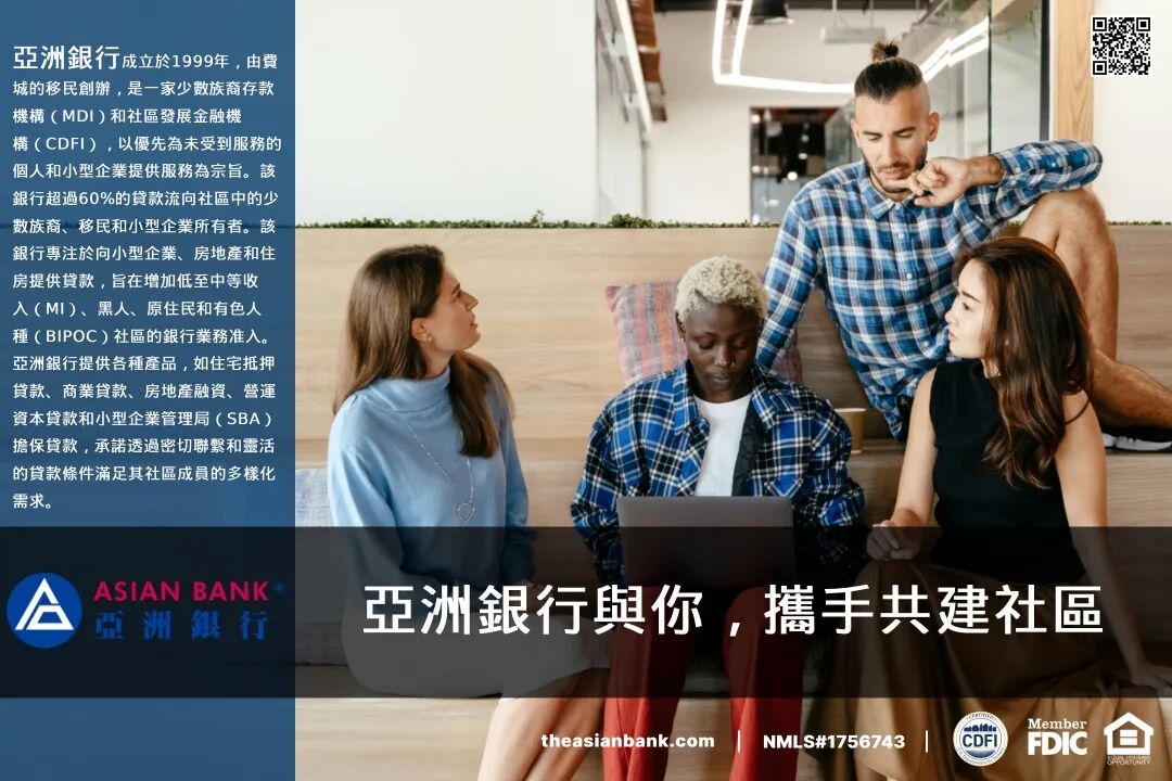 更重要的是,亚洲银行发源于唐人街,扎根华人社区,正如亚洲银行主席王怡康先生所说:“亚洲银行把客户储存的每一分钱都回馈于社区。我们承诺,我们将努力工作,认真服务每一位客户、谨慎对待每一笔投资,赢得您的信任。”