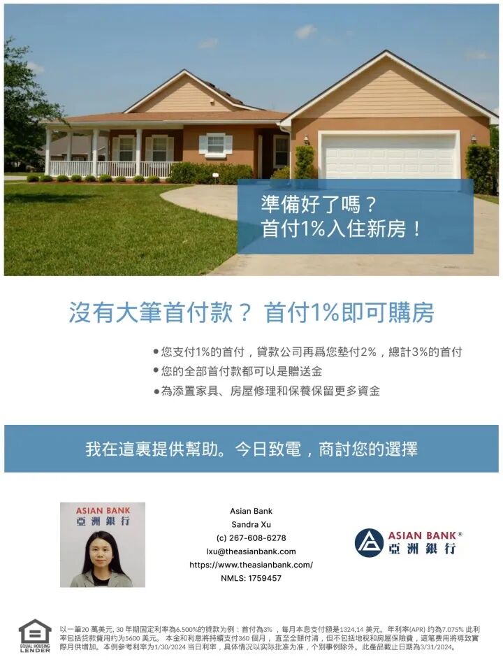 不管是想要安家的新老移民,还是住房需求更新的各位房主,购房都是人生大事。亚洲银行不仅为您量身定制按揭方案,而且特别推出首次购房者只需1%首付的独家优惠。您的Dream House马上拥有~这幸福,来得太突然了!