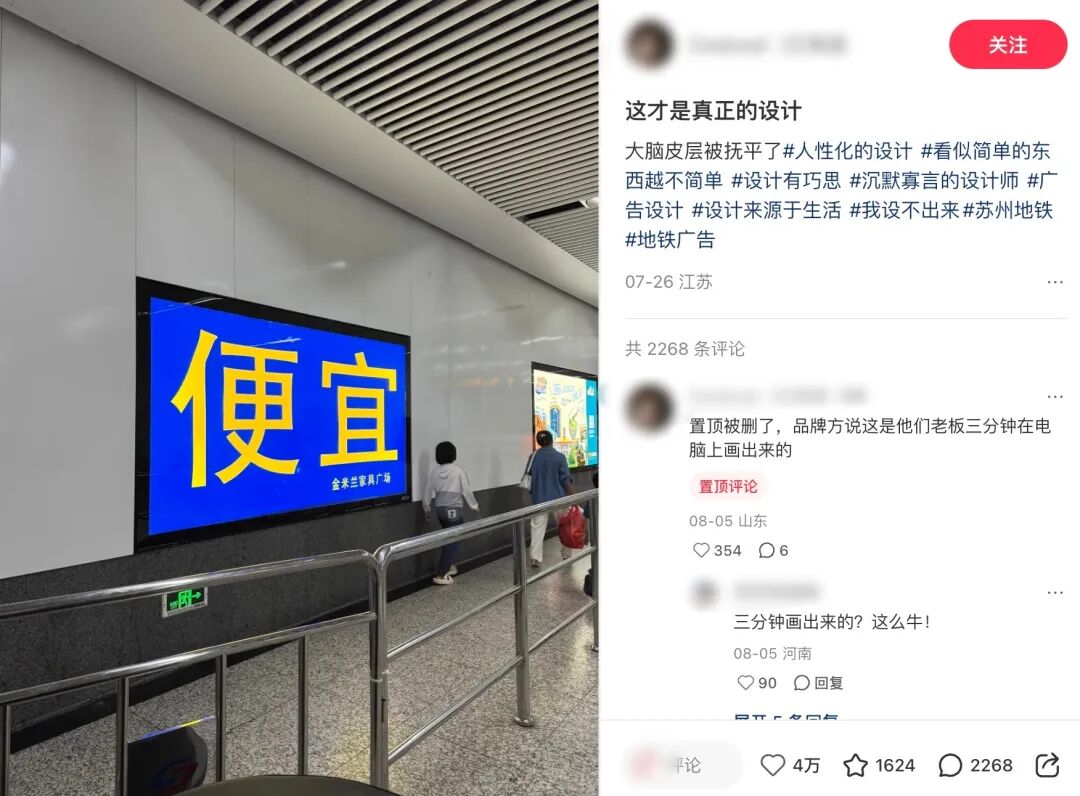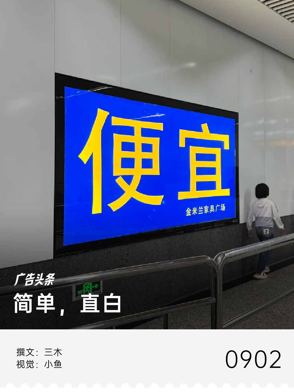 刷到网友分享的地铁广告,蓝底黄字,画面简单,只有硕大醒目的两个字“便宜”,下方再附上家具广场的名字,被网友夸赞“这才是真正的设计”,看完感觉大脑皮层被抚平了,在短时间内收获了不少人的讨论。