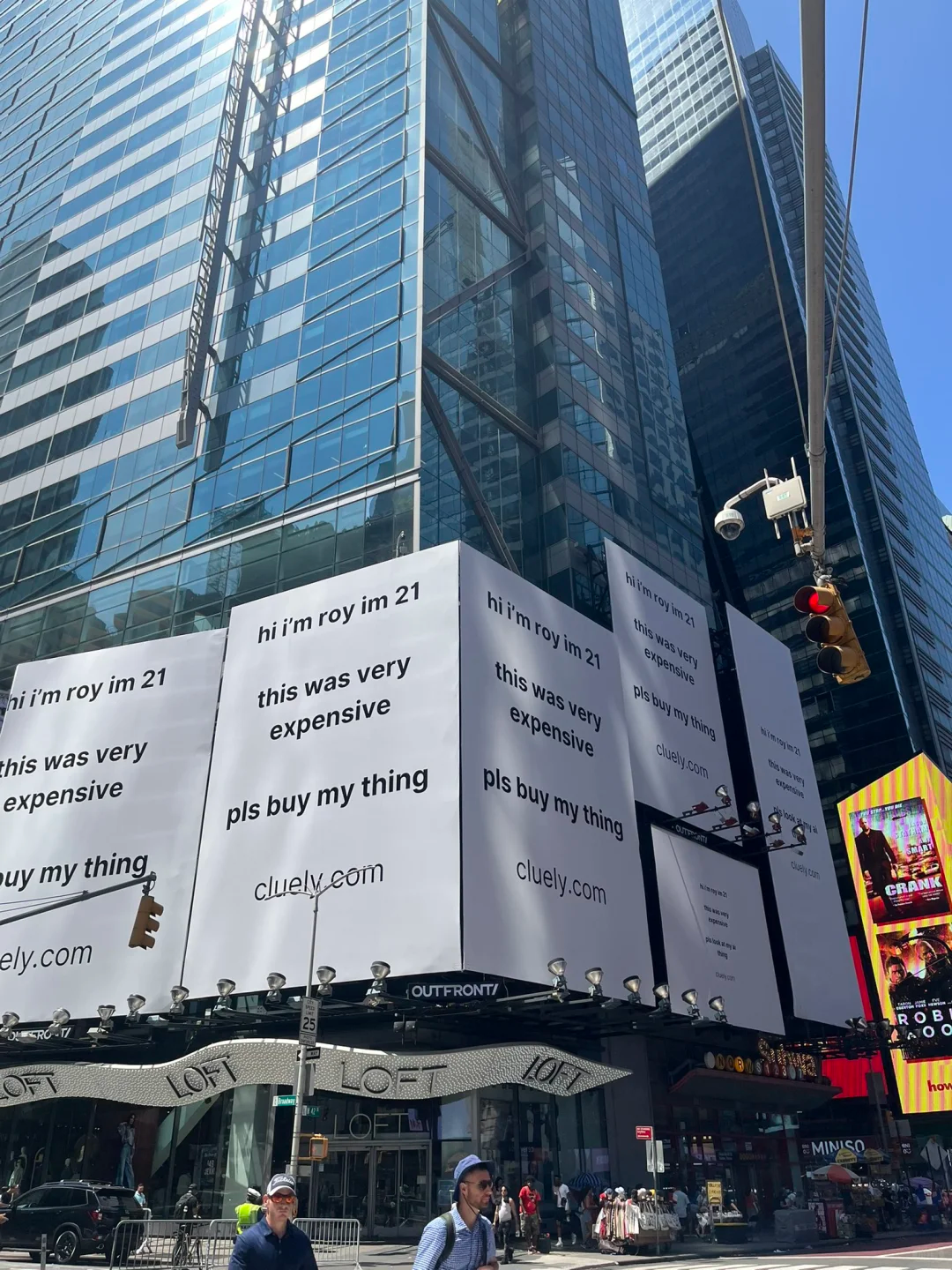 纽约时代广场的广告位,是全球品牌挤破头都想拿下的“流量高地”,曝光量顶级,成本也是高到按秒计费。但出人意料的是,一位 21 岁的 CEO Roy ,用一组 2 块钱质感的文案,就霸屏了这价值百万的黄金广告牌。