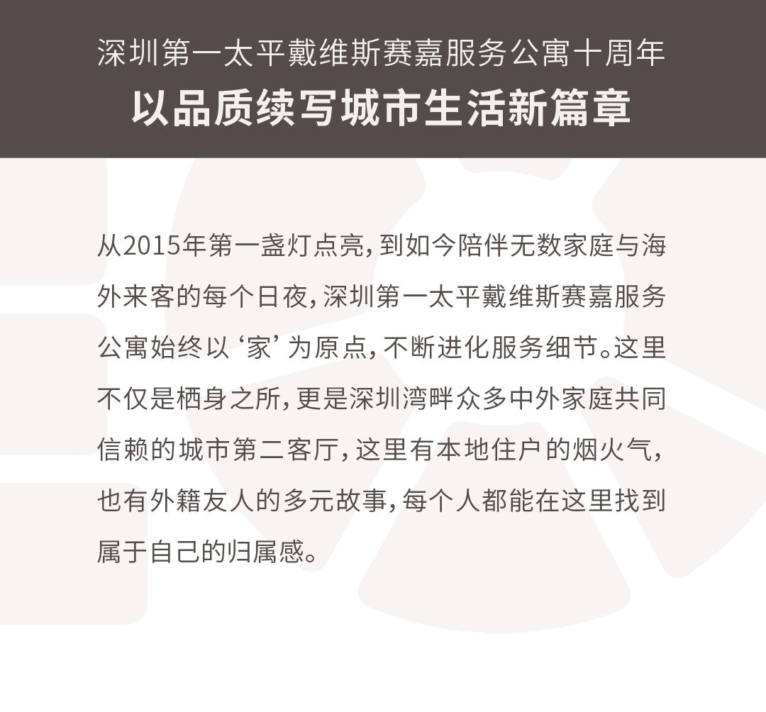 2016年初,当来自英国的Mr. Williamson和法国太太第一次踏进公寓时,他们漫长的找房之旅终于画上了句点。此前,他们拖着行李箱看过很多不同的公寓,却始终难觅理想中的家,直到遇见深圳第一太平戴维斯赛嘉服务公寓。“走进大门的瞬间,明亮的大堂、前台递来的热茶、服务人员的微笑…那一刻我们知道,就是这里了。”Mr. Williamson回忆道。