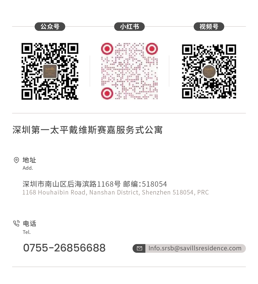 在深港 “双城生活” 的澎湃浪潮中,深圳第一太平戴维斯赛嘉服务式公寓地理位置优越,坐立于深圳南山后海滨路,成为连接双城的璀璨明珠,靠近深圳K11 ECOAST、海上世界及深圳湾口岸,交通便捷,可以让您在深港之间自由穿梭,无论是前往香港开启商务之旅,还是周末赴港购物休闲,都能轻松实现。
