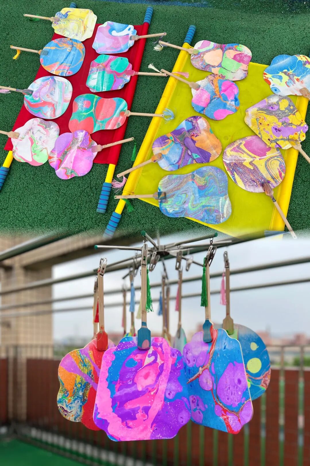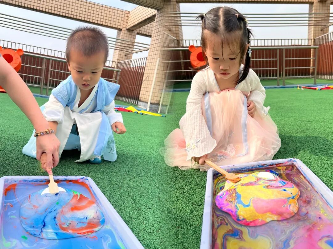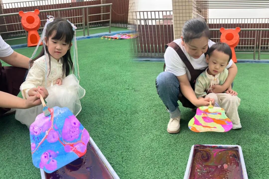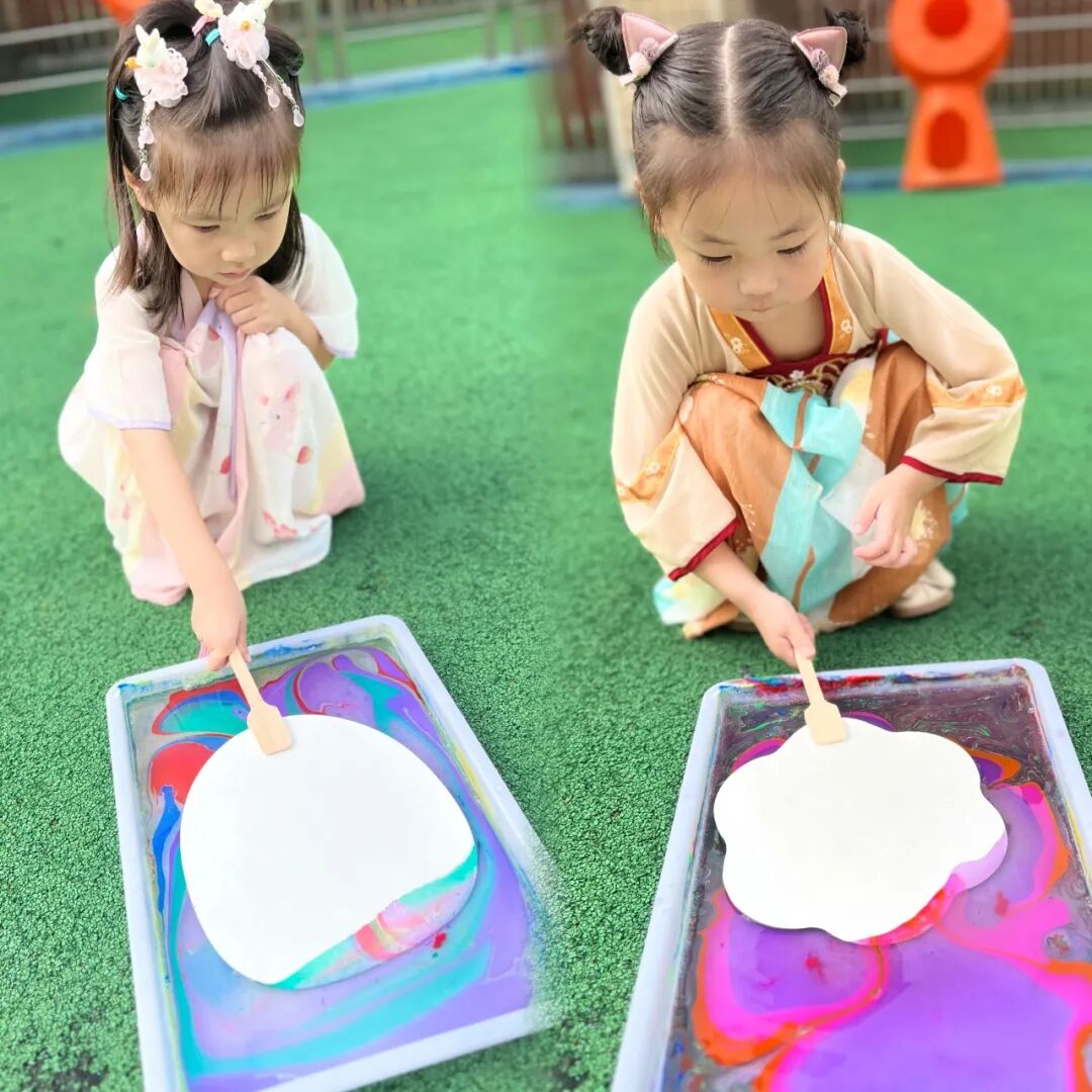 团扇自它诞生之日起就被融入了中国传统的吉祥意趣。中秋本就是团圆佳节,而团扇就寓意团圆。其二,团扇形似明月,中秋赏月也是一大雅事。平静水面,寥寥数笔,竟也能创造出一张精致的图画?在装满水的长方形盒子里,将颜料滴在水面上,用笔挑开,看水面上星星点点,色彩明丽,造型灵动。这便是我们今天让扇子穿上漂亮衣服的办法——水拓。要知道,这可是世界非物质文化遗产呢!