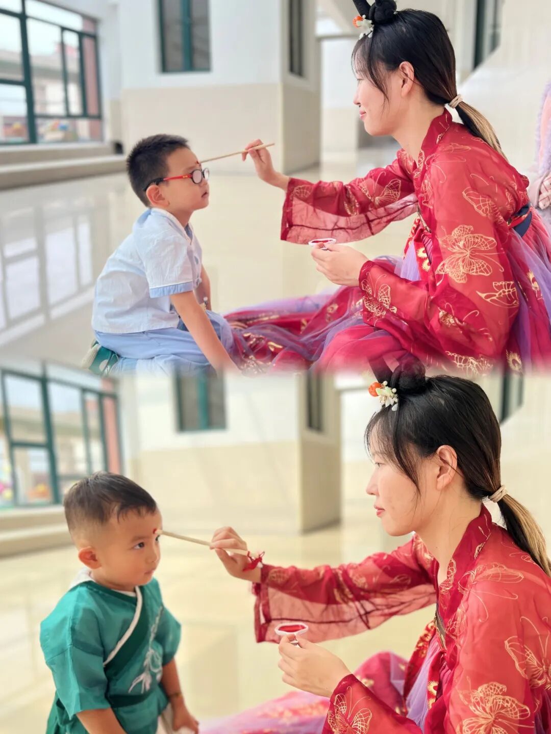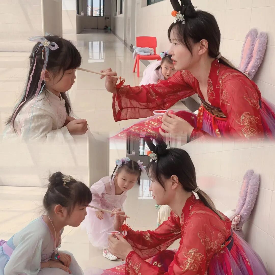 点朱砂是一种文化,寓意着吉祥美好,老师为孩子们在眉心点朱砂,寓意着开启智慧、端正品行。