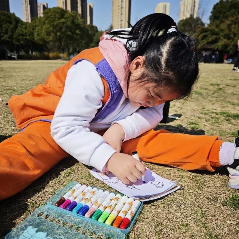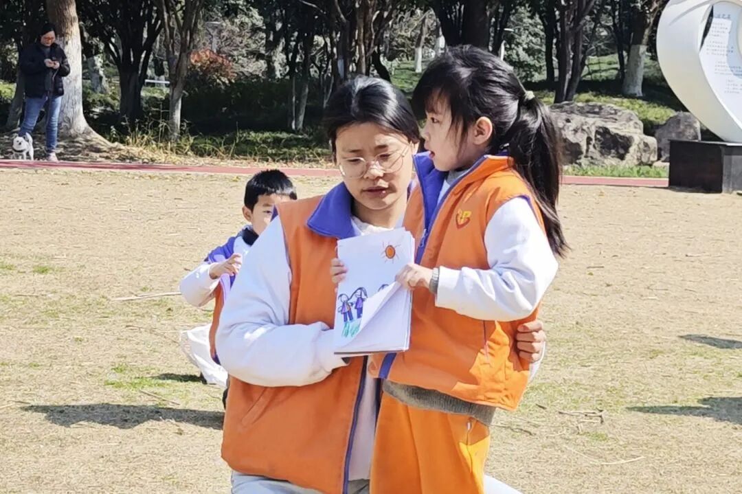 活动尾声,孩子们围坐在一起,用画笔记录自己的收获和感受并和同伴分享:“我发现春天的小草特别嫩,踩上去软软的。”“春天的风暖暖的,吹在脸上好舒服。”“我最喜欢的春天颜色是绿色,因为它让我想到希望!”稚嫩的话语里藏着对自然的细腻感知,更透露出协作与思考的智慧。
