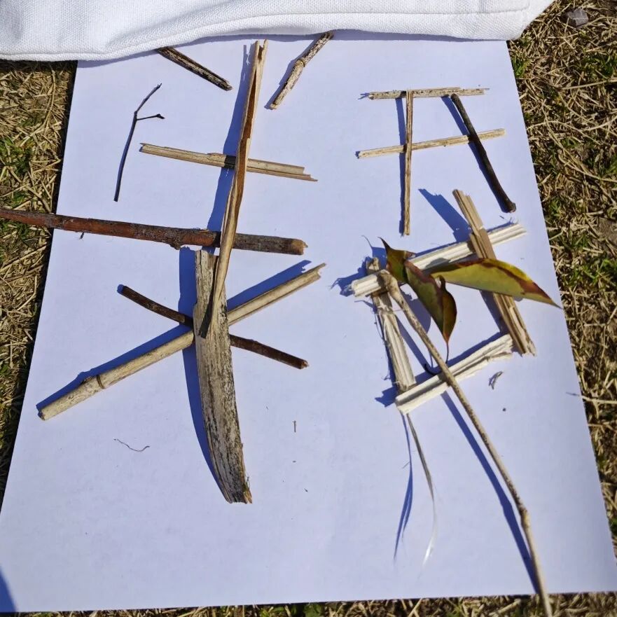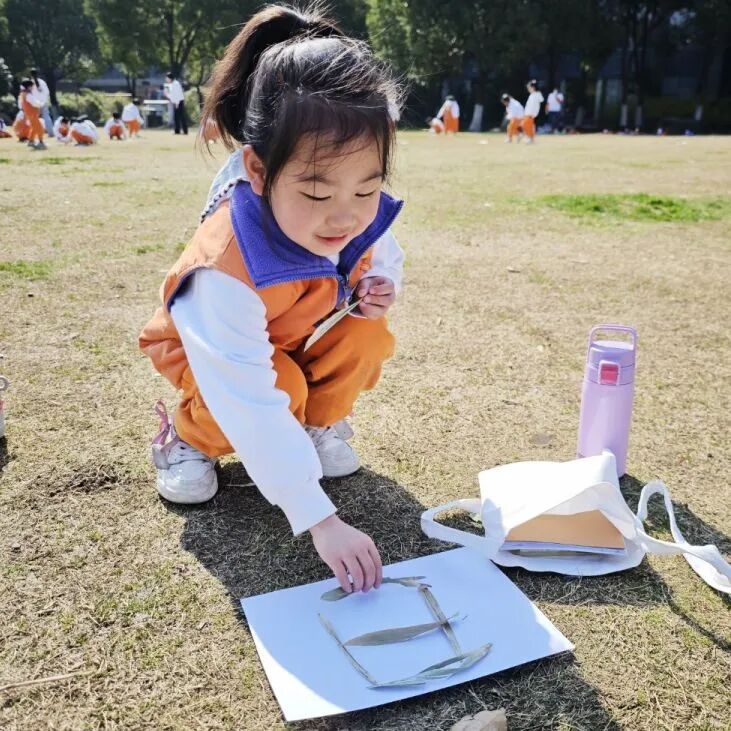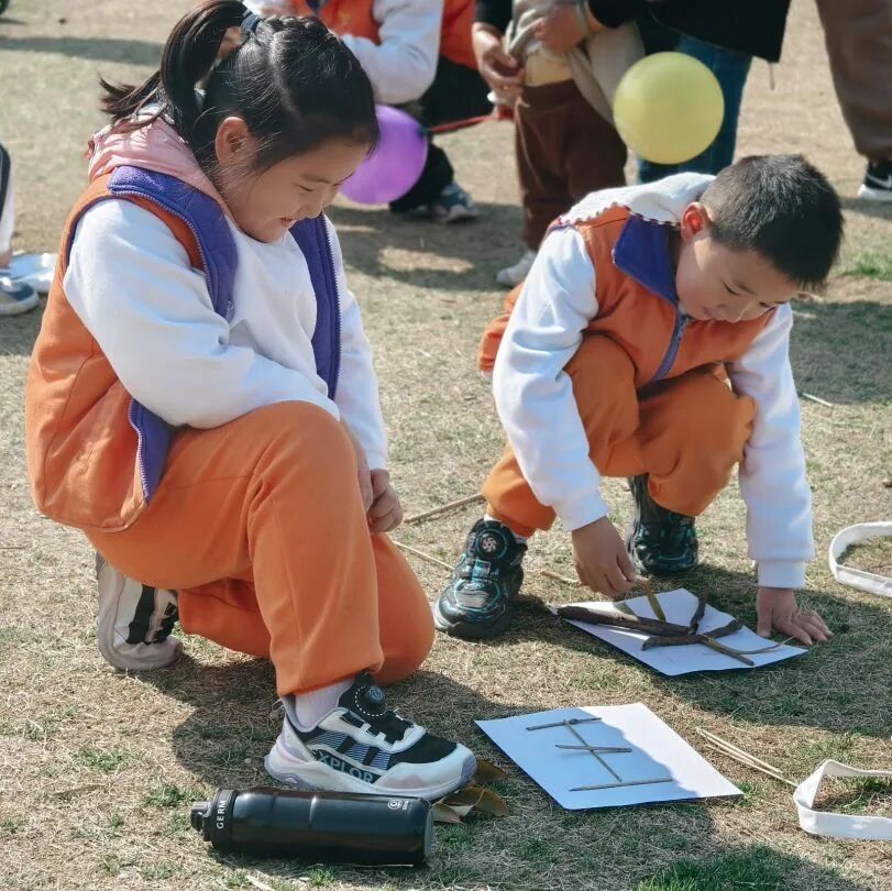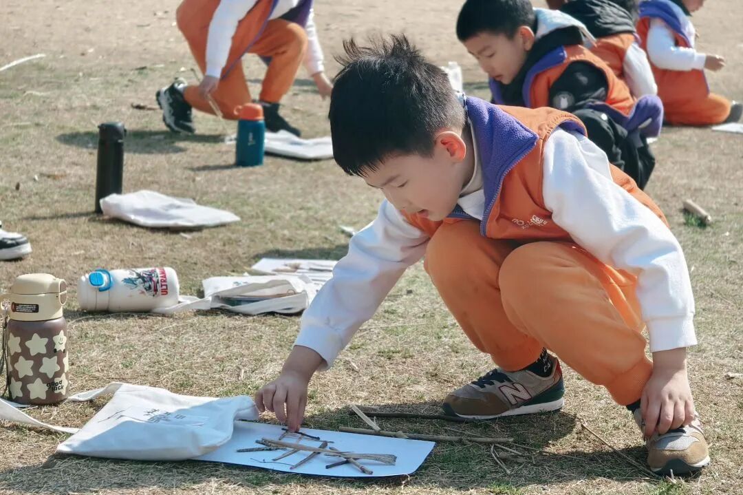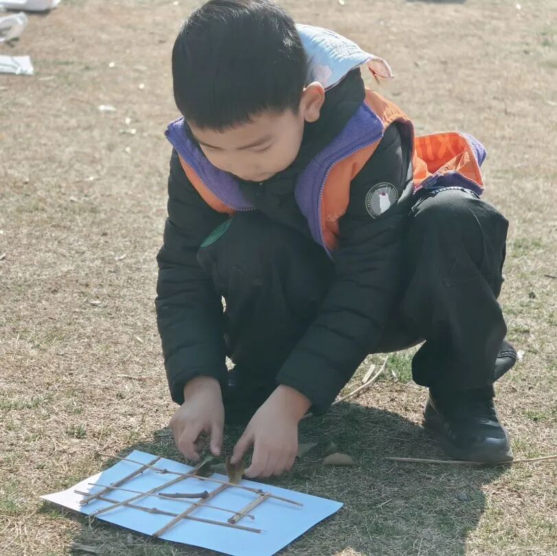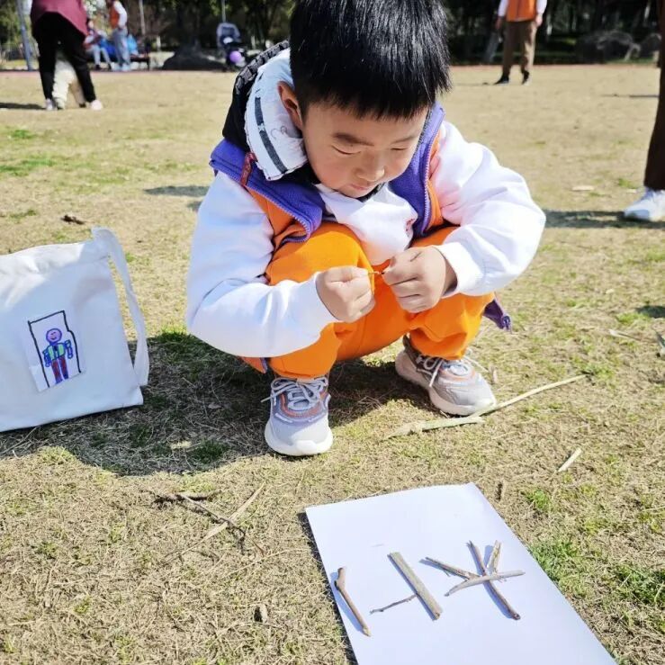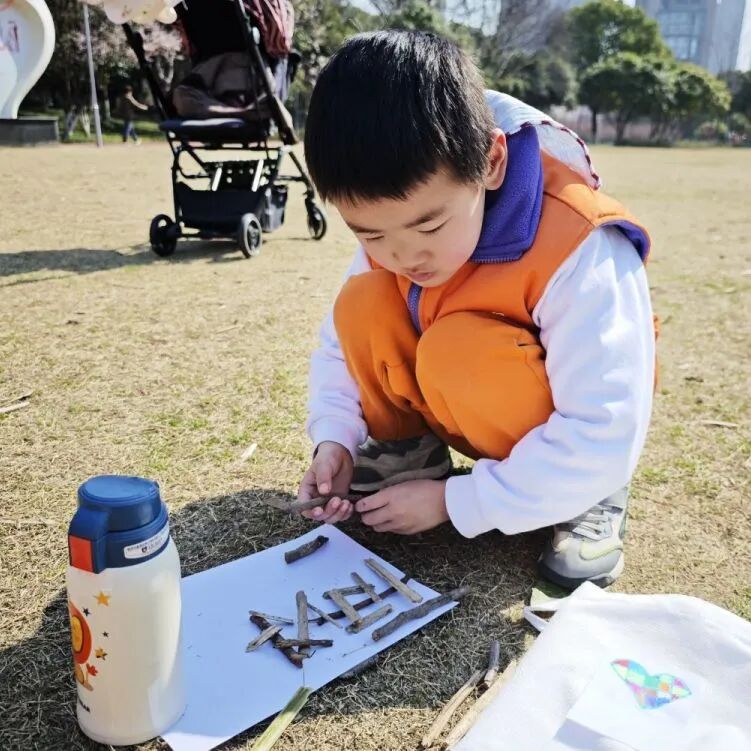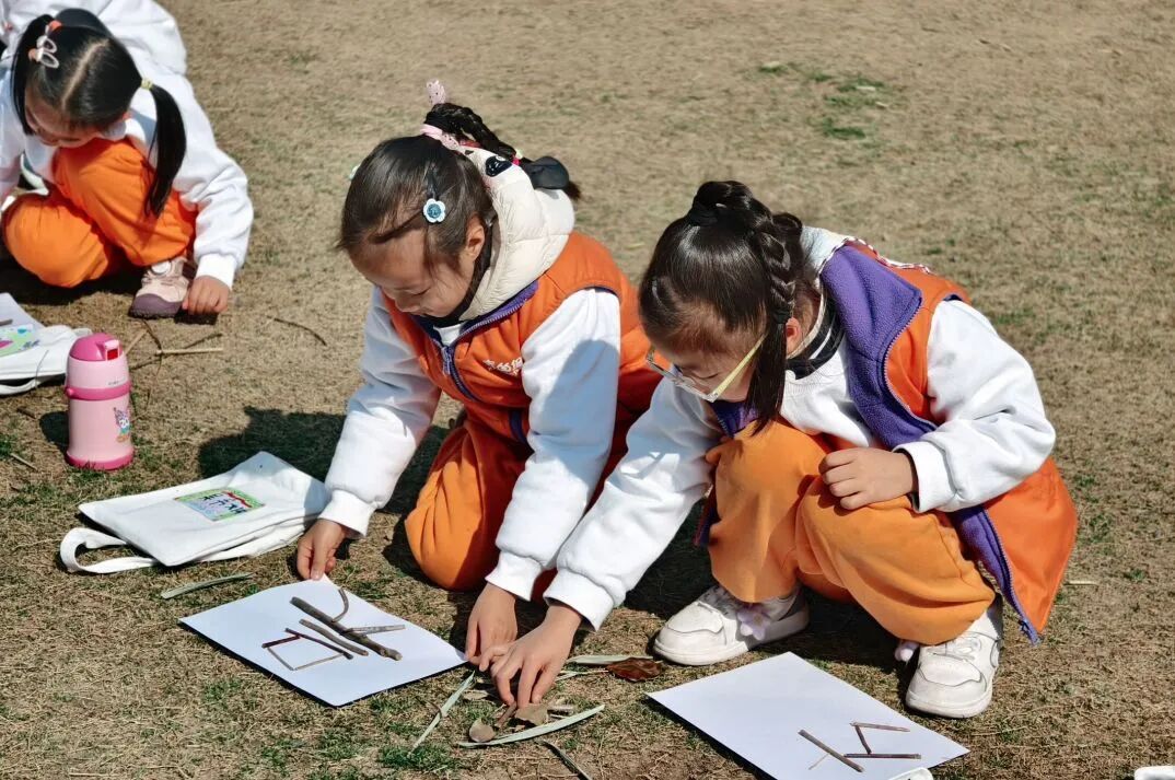拾一片落叶作横,捡一截树枝为竖,孩子们用收集的落叶与树枝拼出自己的姓名和认识的汉字“春”“森”“友”。稚嫩的小手摆弄着自然的碎片,每一个文字都承载着他们对春天的理解,在操作中领悟汉字的结构之美,更懂得“一草一木皆可成诗”