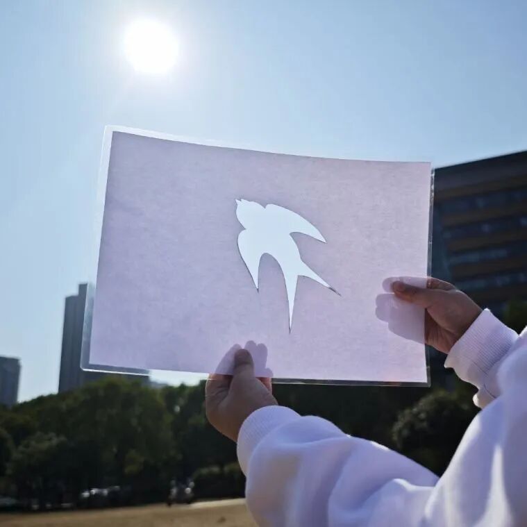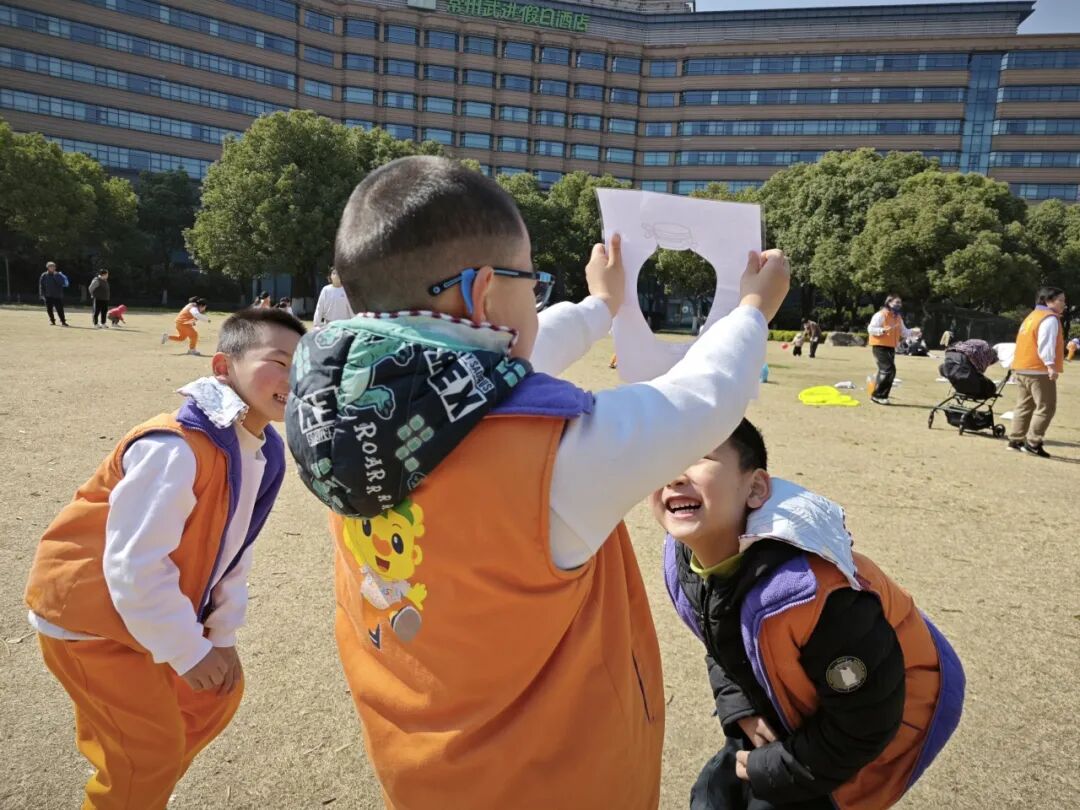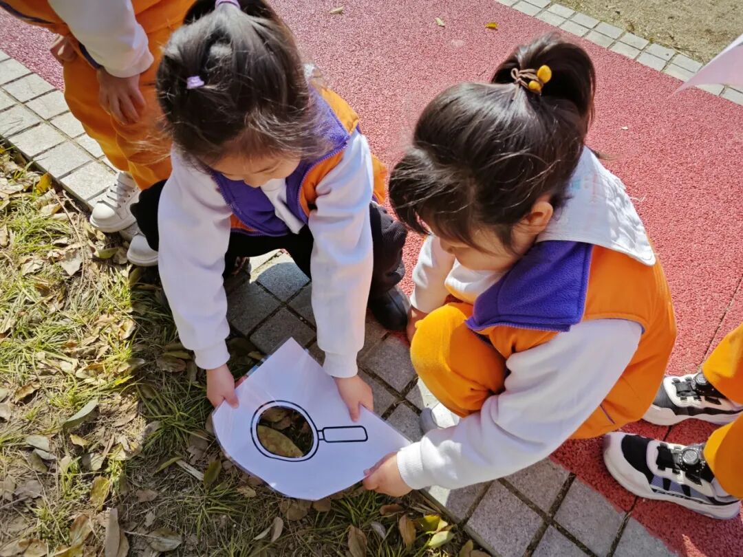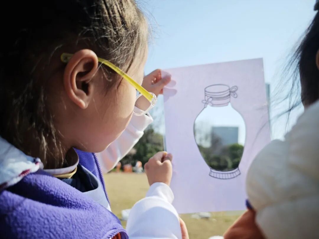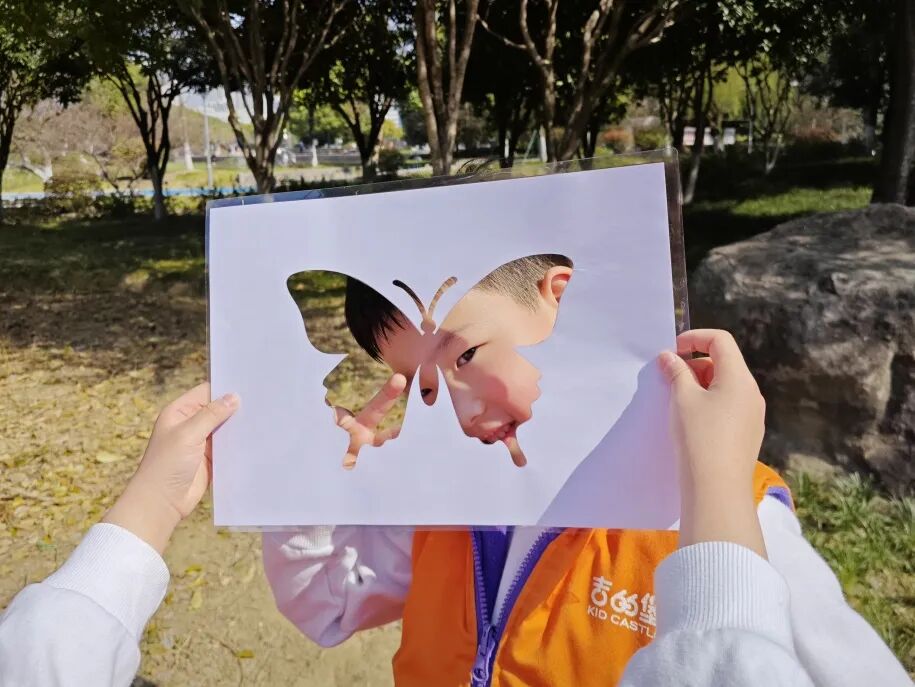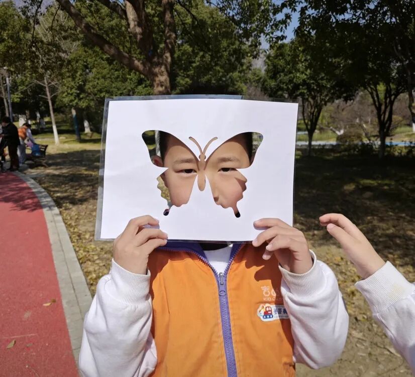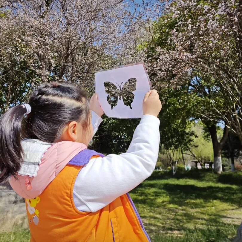 纸上剪出各式各样形状的镂空画框,让春天的风景透过镂空展现出来,孩子们举着画框穿梭于林间,寻找与图案完美契合的风景。“老师!我的蝴蝶落在草地上啦!”透过方寸之间的留白,孩子们学会用专注的目光捕捉春天的细节。
